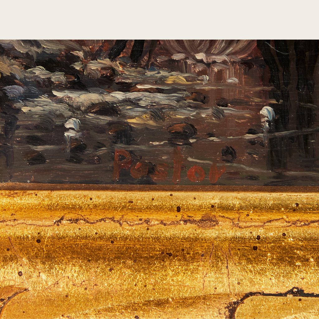 Oil on panel in gilded frame painted in the Haarlem landscapist style. Featuring a scene of a group of men skating on a frozen lake. With a hazy and vibrant sky backdrop. Signed illegibly on the bottom right corner. Date and artist unknown.