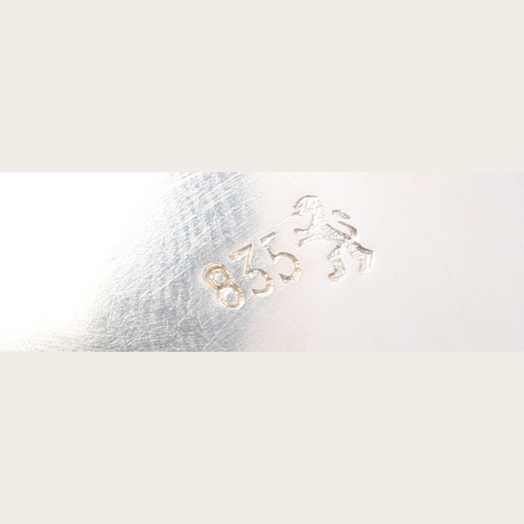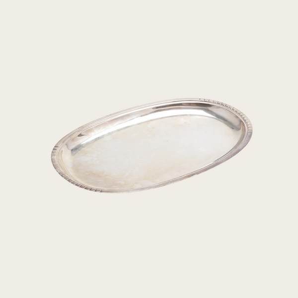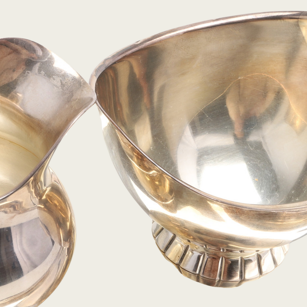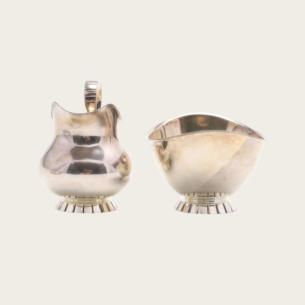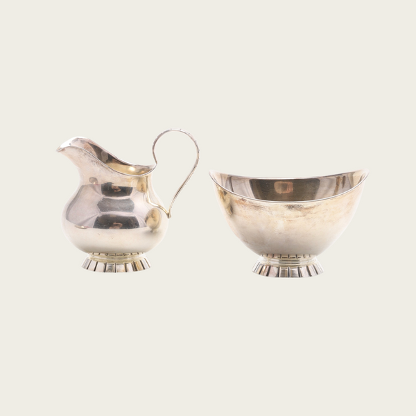 1930s Art Deco three-piece set features a sugar bowl, milk pourer, and tray crafted from nickel silver. Each piece showcases elegant linear engraved details along the bases and the tray’s perimeter, reflecting the clean, geometric style of the era.
