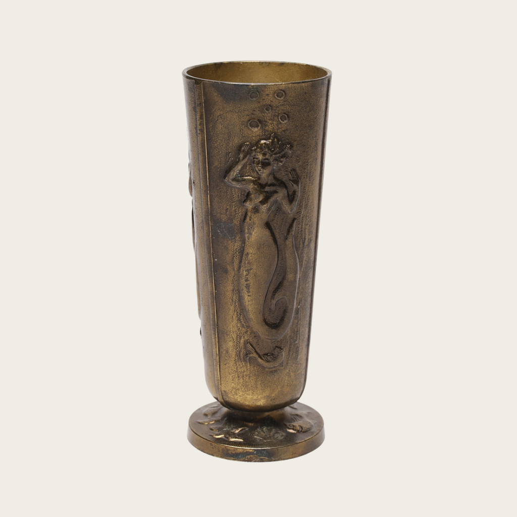 With a group of three different mermaid reliefs sculpted into a vase. With flared base detail. Maker unknown. Marked “Made in Sweden” on underside.