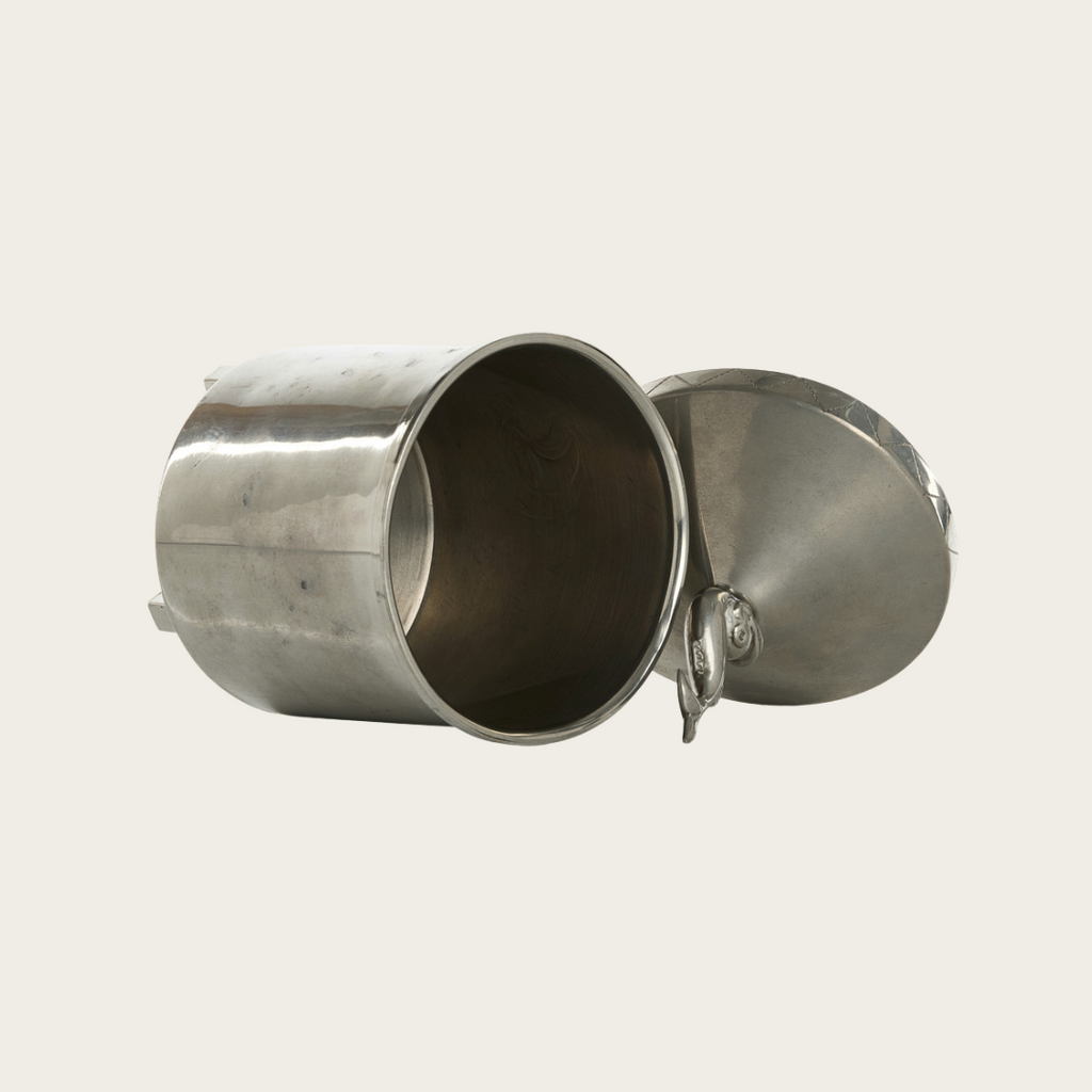 1930, Sweden. Swedish Grace lidded jar with detailed engraving of a ship with sail. Jar lid is crowned with a decorative dolphin. With feet and decorative engraving designs throughout. Marked Ystad Tenn and with Athena marking on underside.