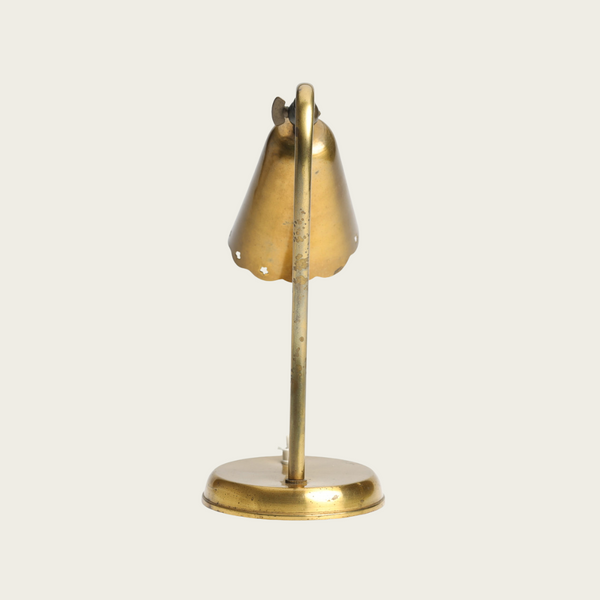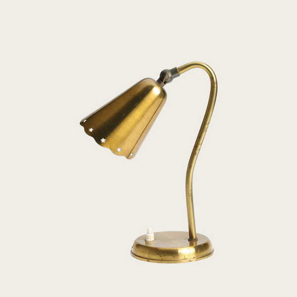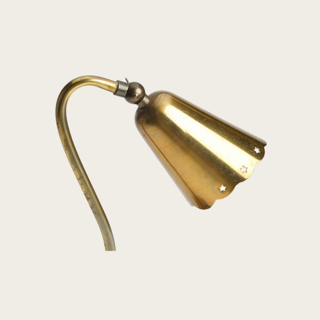 1940s, Danish. A brass lamp crafted with a brass finish features star-shaped perforations around the shade’s edge, casting unique patterns of light. Its adjustable neck allows easy customization of the shade’s angle and rotation, providing flexible lighting to suit your needs.