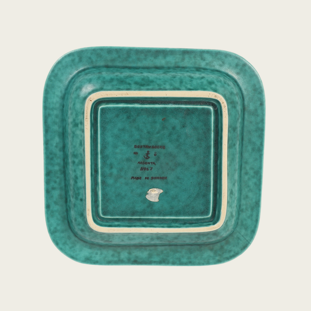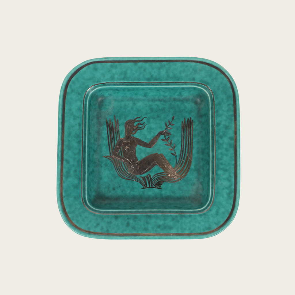 1972, Sweden. This footed dish is a striking example of Wilhelm Kåge’s Argenta collection for Gustavsberg Factory. Crafted in stoneware, it features a speckled turquoise glaze and silver leaf detailing that highlights an Art Deco mermaid at its center. The dish bears the maker’s mark on the underside.