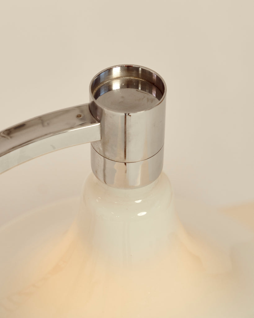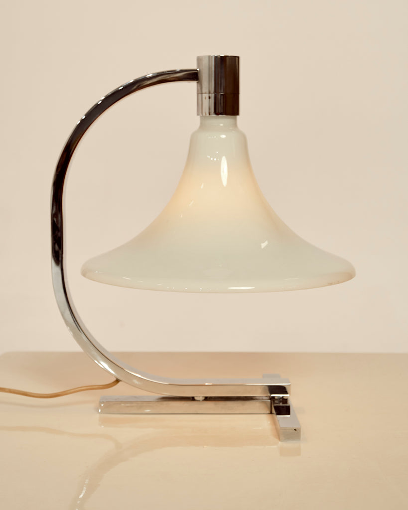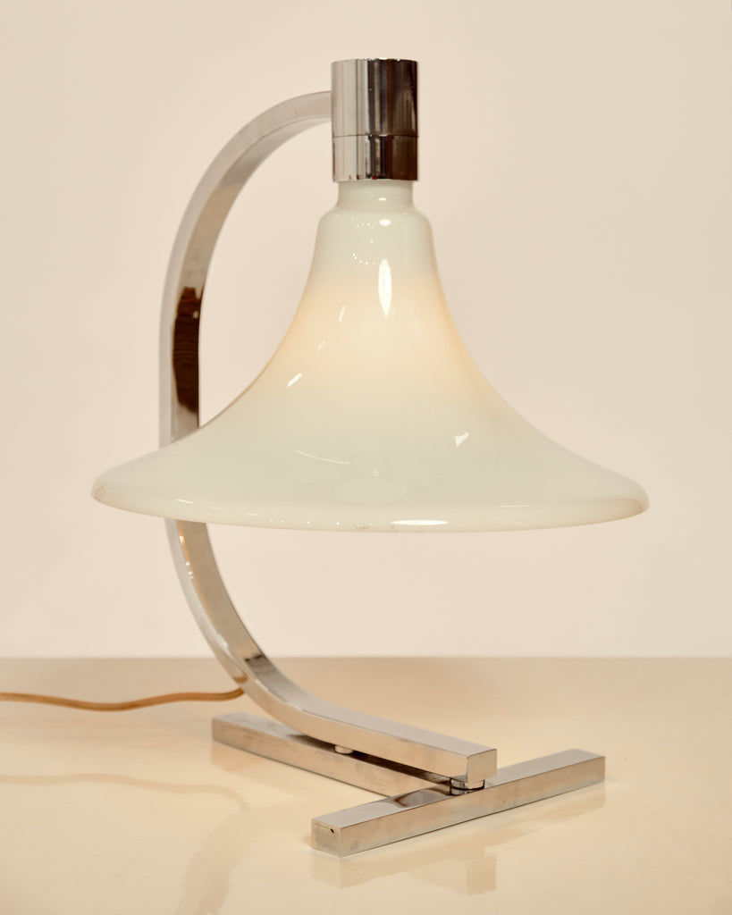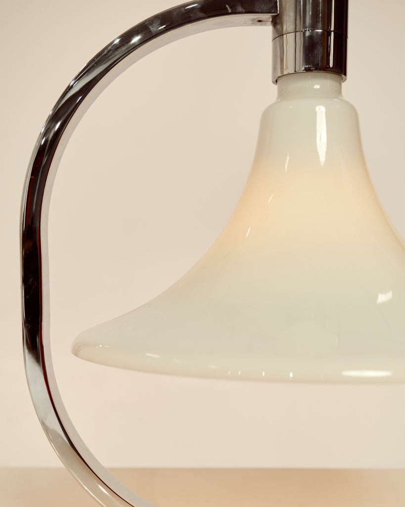 1969, Italy. This table lamp, created by designers Franco Albini and Franca Helg and produced by Sirrah, is part of the AM/AS series—a versatile modular lighting system with interchangeable bases and shades. It is in excellent original condition with no glass damage.