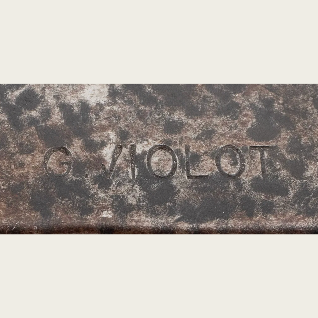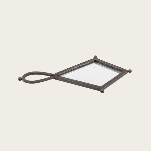 This French wrought iron hand mirror features a diamond shape with subtle ball accents at each corner. It is signed "G. Violot" on the back and includes a finely beveled mirror glass edge. The handle allows it to be used as a handheld mirror or hung on a wall.