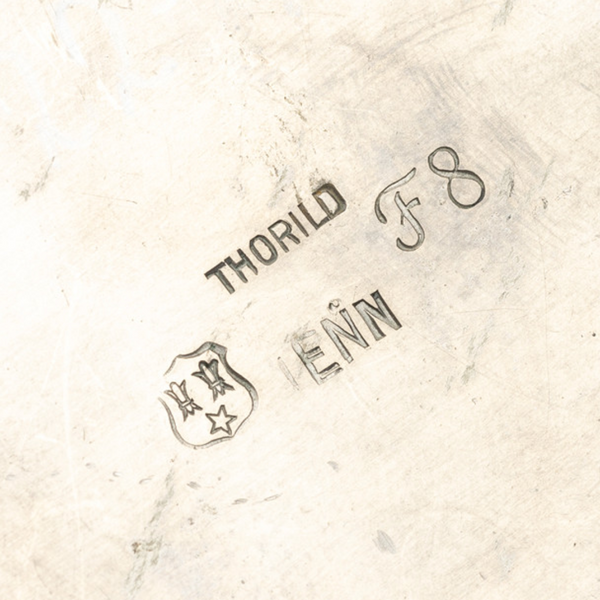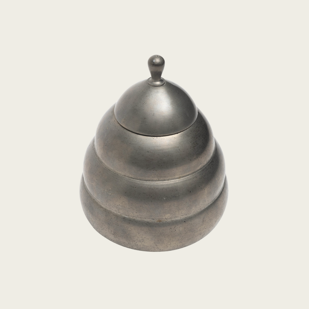 1932, Sweden. This honeycomb-shaped lidded pewter box by Thorild Knutson for Gränna Tenn, his metalwork studio in Sweden. The box features a distinctive cone or honeycomb design and bears the manufacturer’s stamp on the underside.