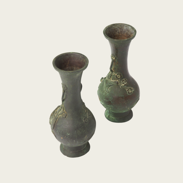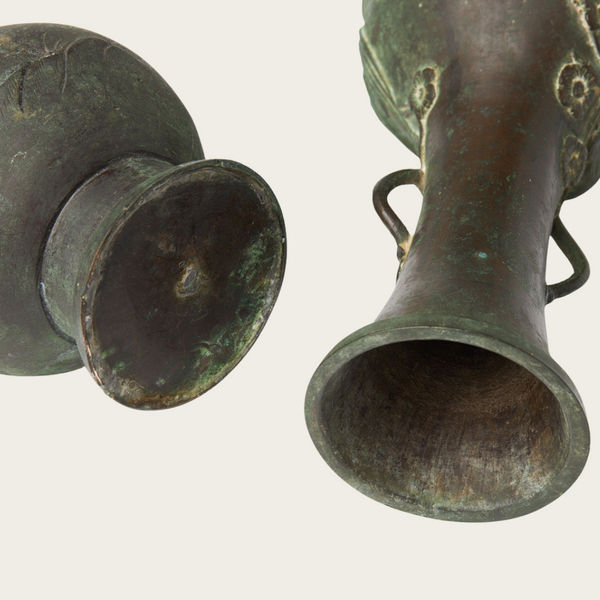 Patinated Bronze Japanese Ikebana Vase with Floral and Bird Relief