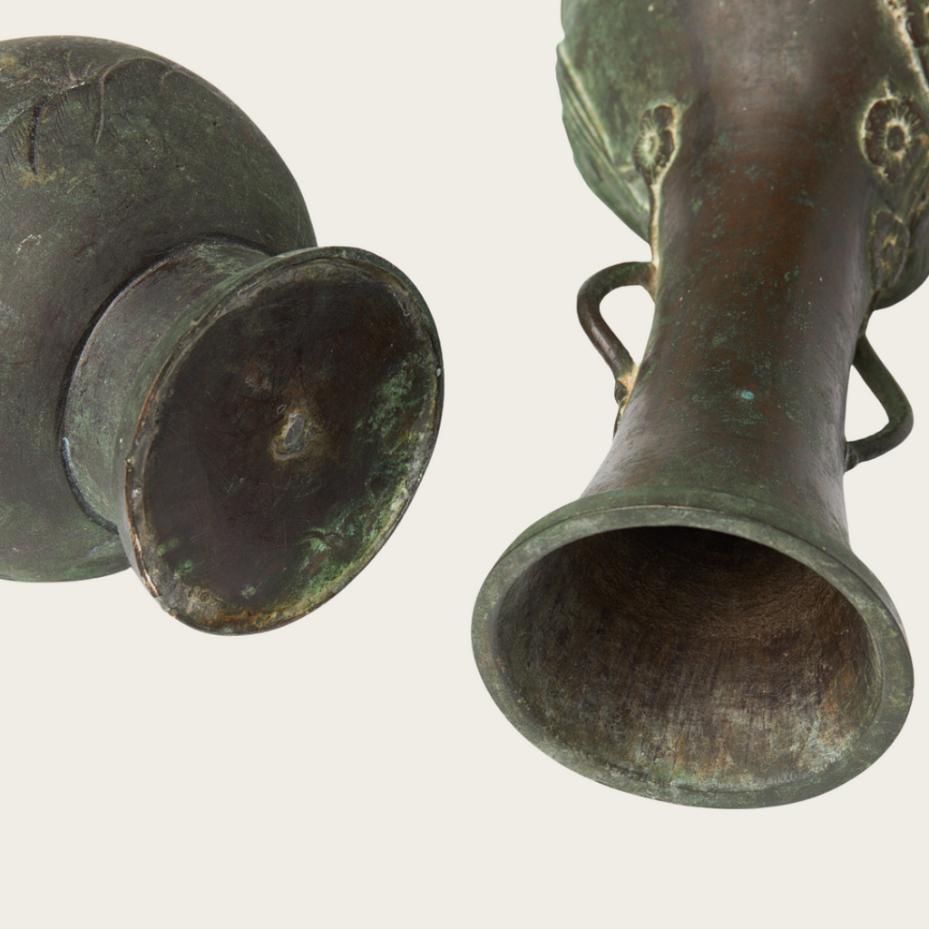 These solid patinated bronze vases from the Meiji period feature decorative hangers and Art Nouveau-style reliefs of woodland birds and flowers. The natural oxidation and patina enhance their antique character. Each vase has a footed base, though the exact designer is unknown, and they are unmarked.