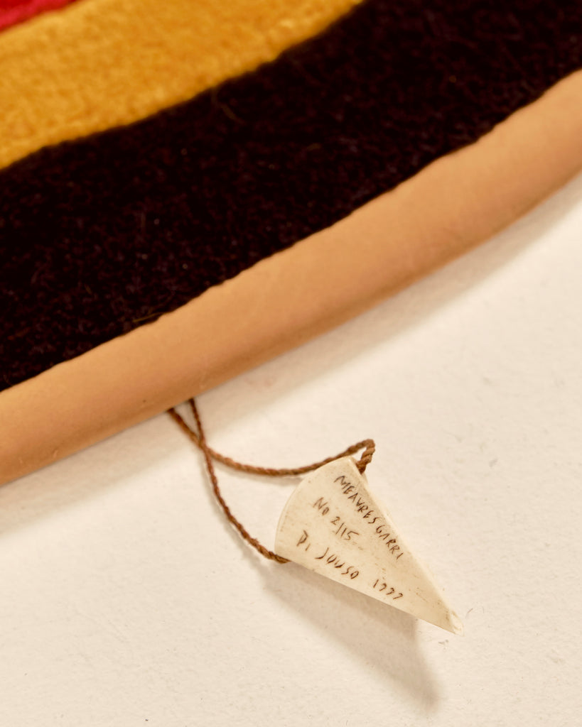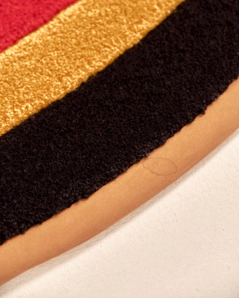 The "Spåtrumma" round area rug was created in 1999 in Mertajärvi, Sweden. Crafted from 100% hand-tufted wool, it features a border of camel-colored reindeer leather. This rug is part of a limited edition of 15, signed 2/15. It includes three original labels, one of which is a face carved from reindeer horn by Per Isak Juuso.