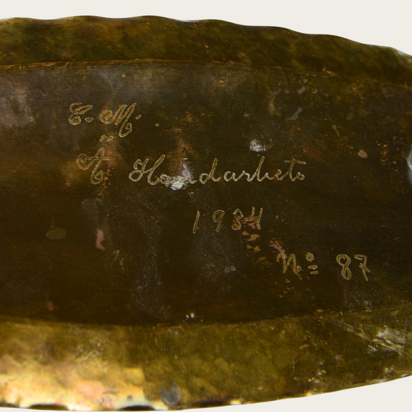 Crafted in Sweden in 1934, these brass wall candle holders feature curved finished edges. The designer’s engraving and date are marked on the back.