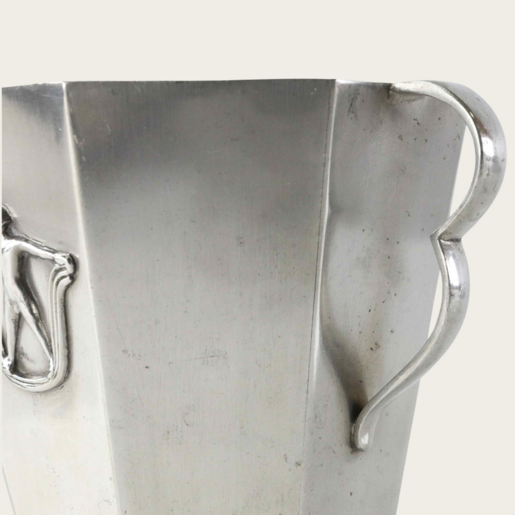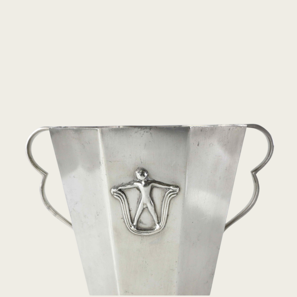 1930s, Sweden. This Swedish Grace vessel by Svenskt Tenn features an angular shape, a relief of a posting figure, and scalloped handles on both sides. The underside is marked.