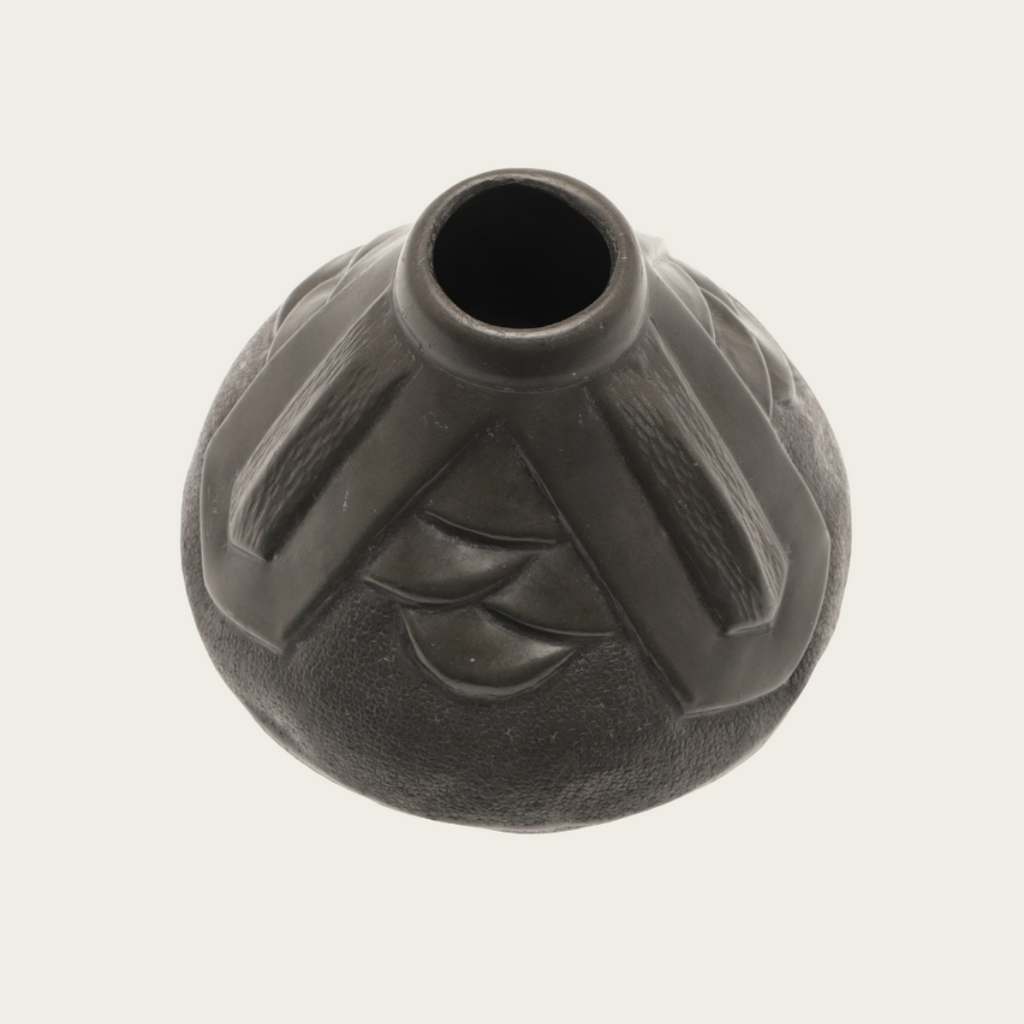 Dating from the 1930s, this vase features a stylized Art Deco architectural design. It is signed on one side and bears impressed marks on the base.