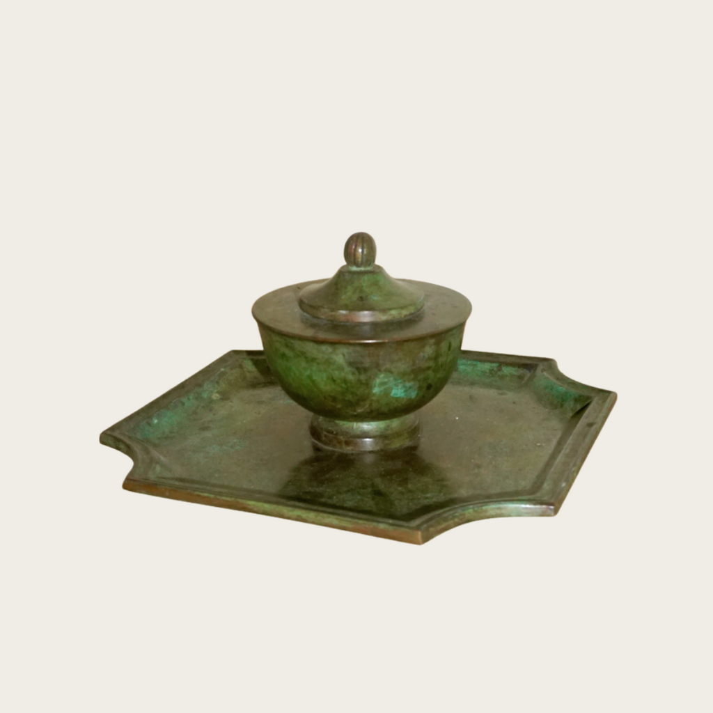 1930's, Sweden. Verdigris patination throughout. A footed jar with lid built into dish. Formally intended to be inkwell, it can be used as a ring dish or catchall. Stamped GAB on underside.