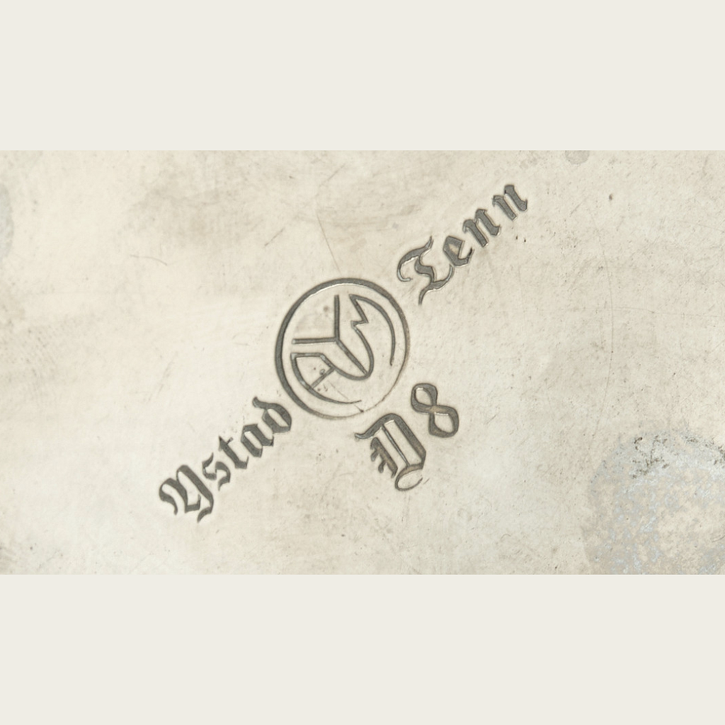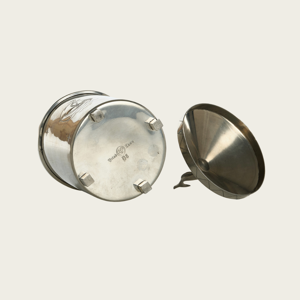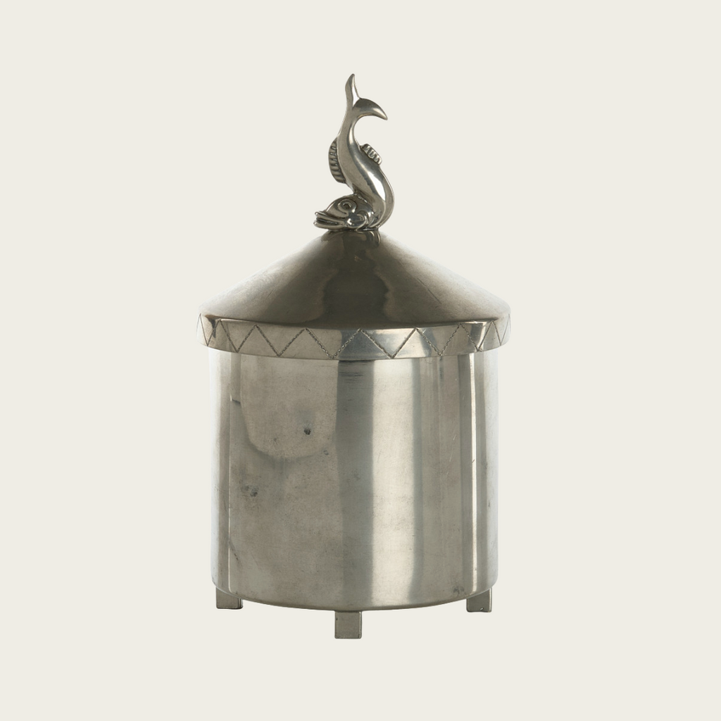 1930, Sweden. Swedish Grace lidded jar with detailed engraving of a ship with sail. Jar lid is crowned with a decorative dolphin. With feet and decorative engraving designs throughout. Marked Ystad Tenn and with Athena marking on underside.