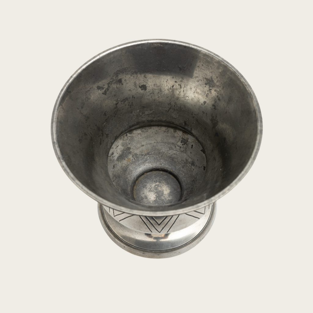 1930s, Sweden. This Swedish Grace polished pewter piece by GAB Tenn features a sculptural, angular shape with a decorative triangular engraved pattern. With a wide mouth, it can serve as either a vase or a bowl. The underside is marked by the manufacturer.