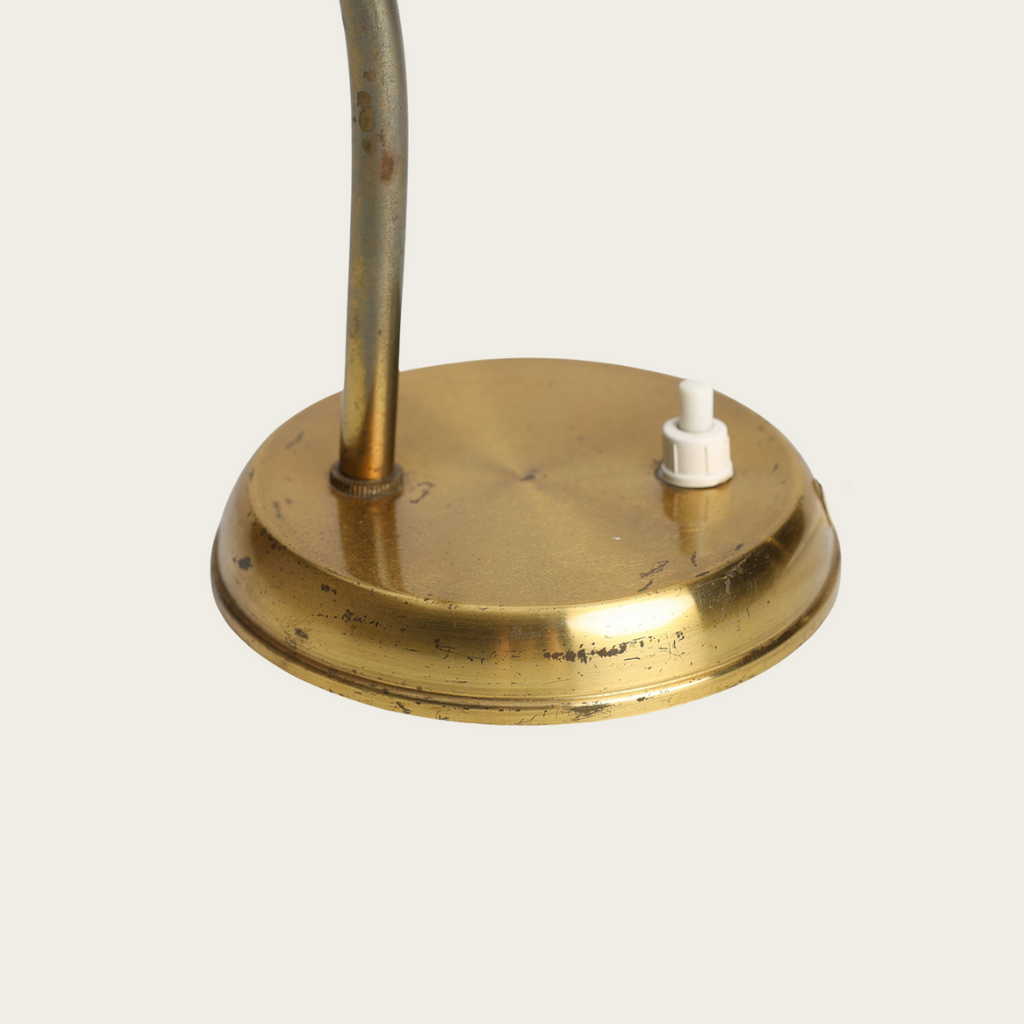 1940s, Danish. A brass lamp crafted with a brass finish features star-shaped perforations around the shade’s edge, casting unique patterns of light. Its adjustable neck allows easy customization of the shade’s angle and rotation, providing flexible lighting to suit your needs.