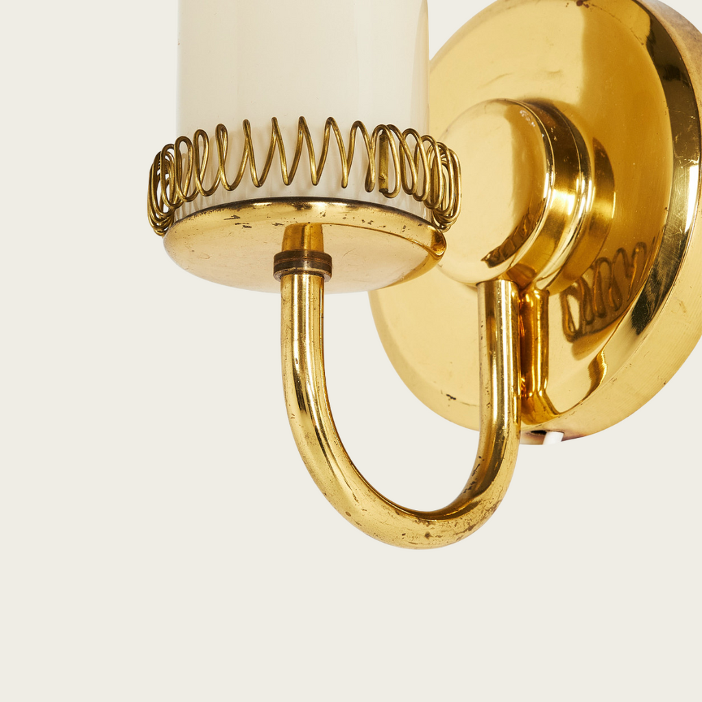 1940s Pair of Swedish Brass and Milk Glass Wall Sconces