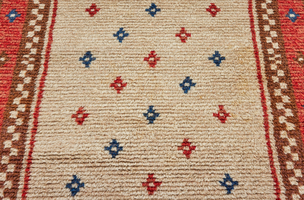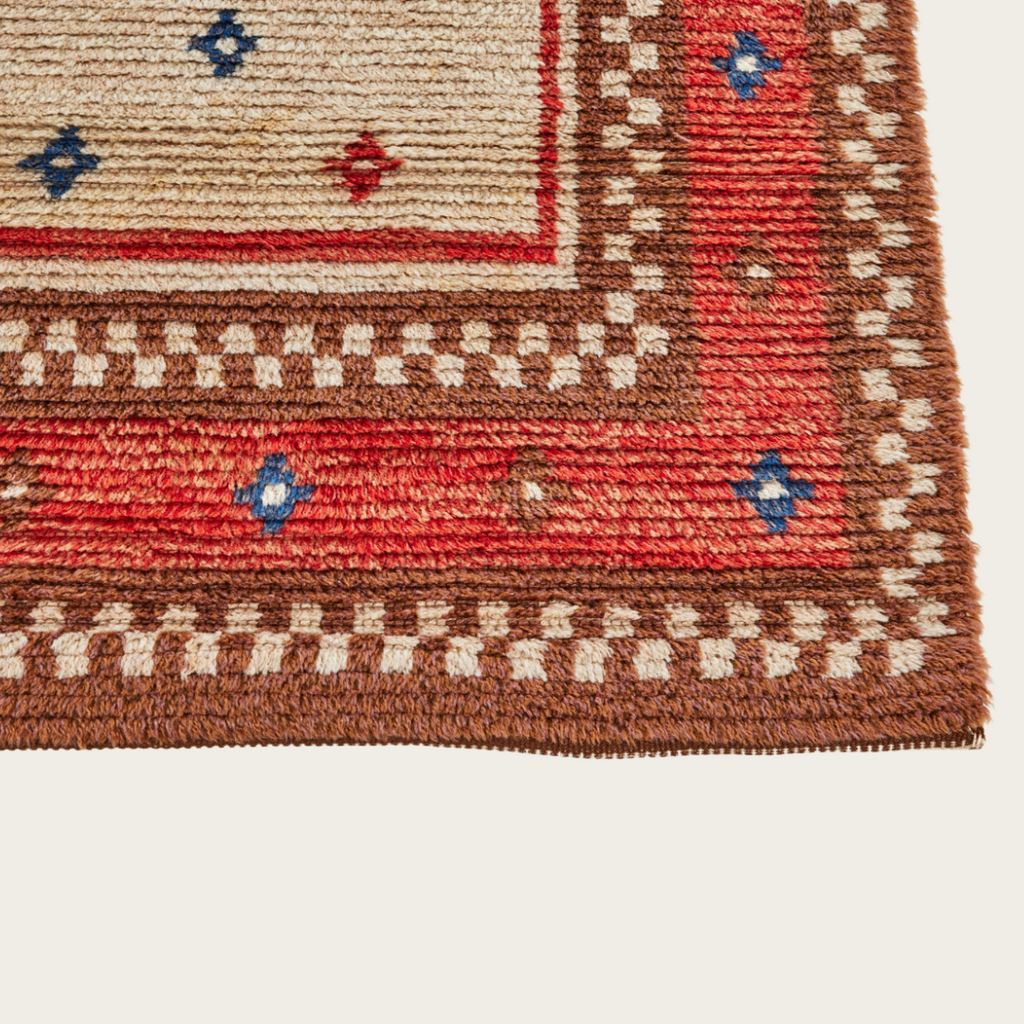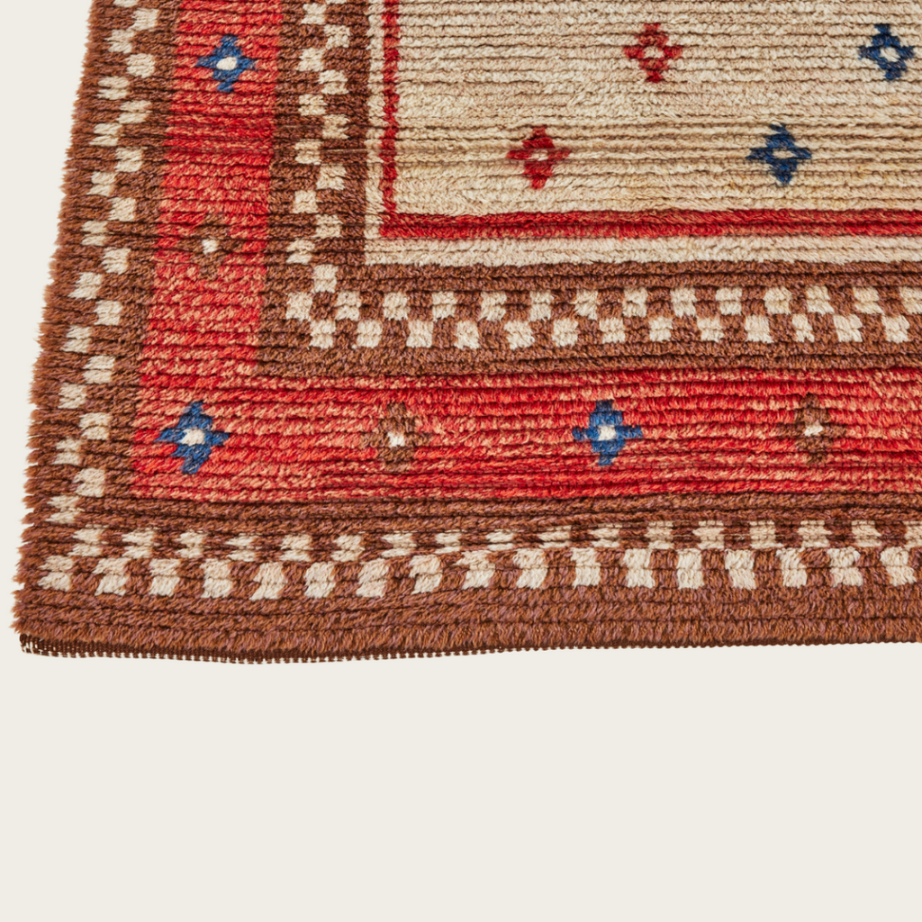 1940's, Sweden. Hand knotted wool, with vibrant red, blue and brown colors and a double checker border. With long pile wool, in great condition.
