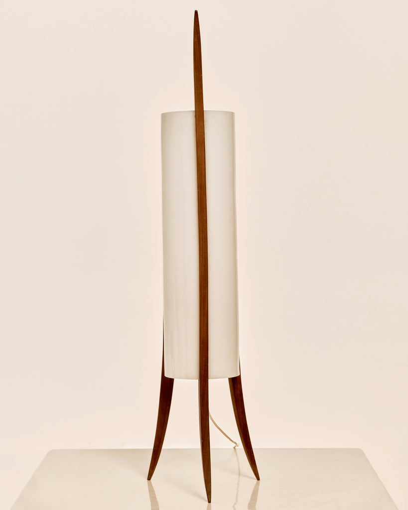1950s, Italy. This floor lamp features a teak frame paired with a white perspex shade.