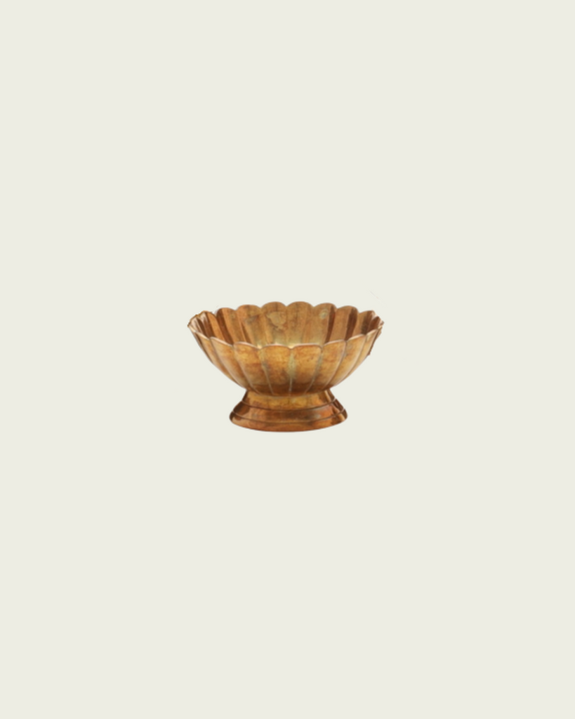 1950s, Sweden. This small brass bowl from the 1950s features elegant scalloped edges and sturdy footed bases, adding a vintage charm to any space. Crafted with quality materials, it serves as both a functional piece and a decorative accent. The designer is unknown.
