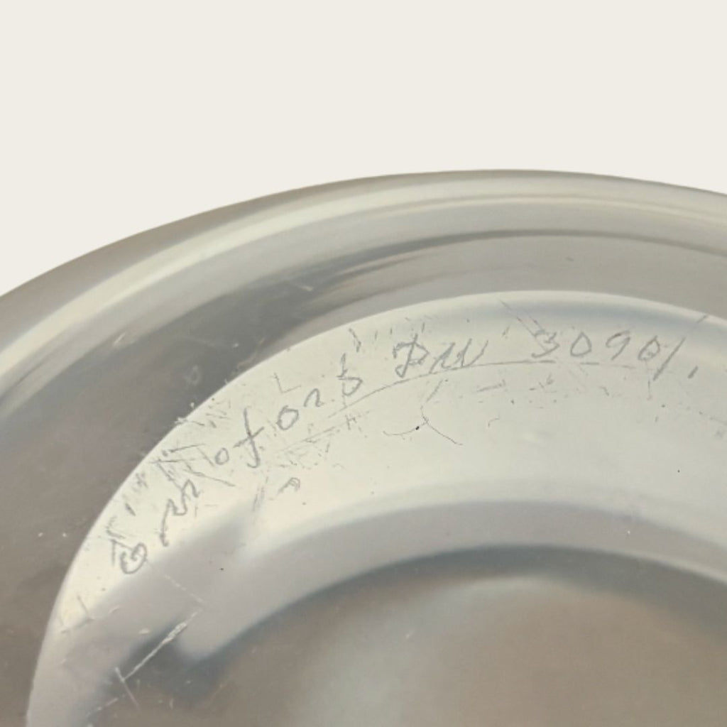 This bowl has smooth, rounded edges and a lovely iridescent sheen. The underside is signed “Orrefors S P 3090/1.”