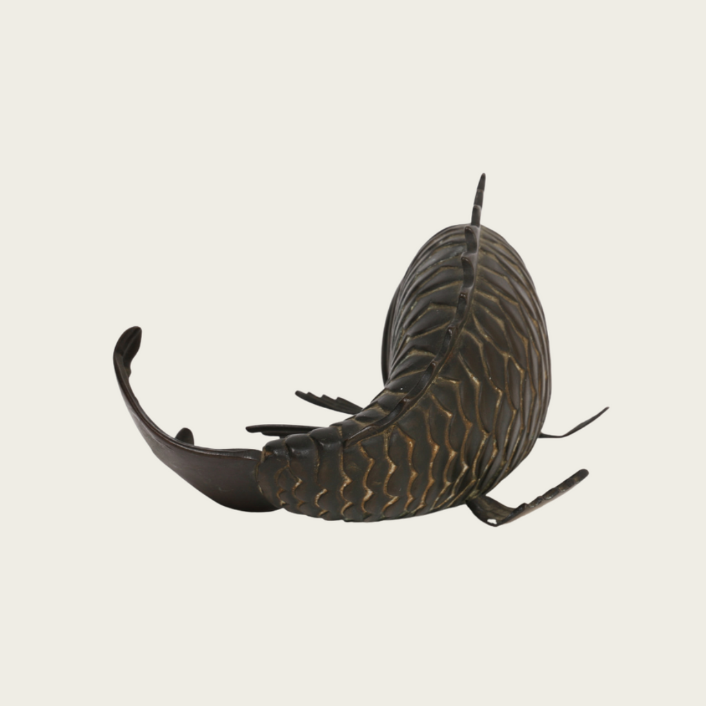 This 1950s solid bronze carp sculpture from England features glass eyes and intricately detailed fins, scales, and tail. The maker is unknown, but the piece is in great condition, reflecting careful craftsmanship and timeless appeal.