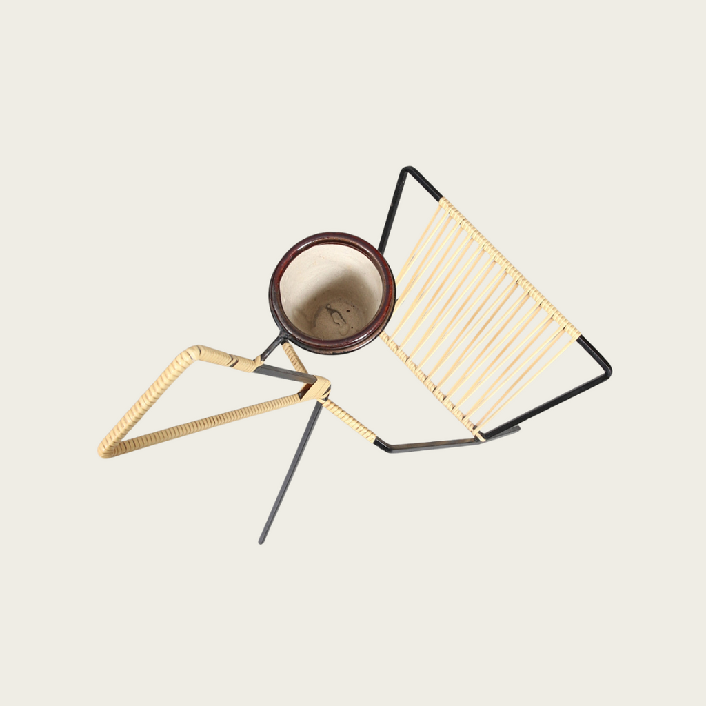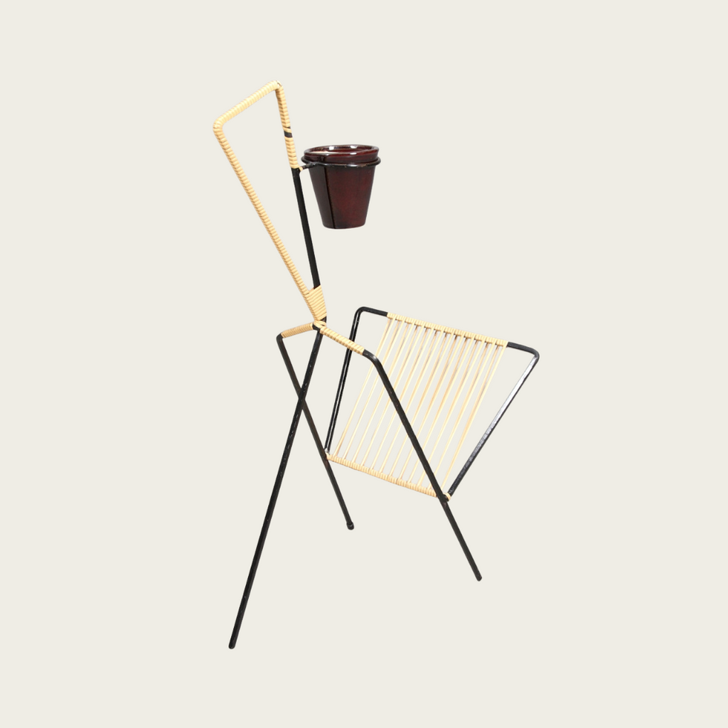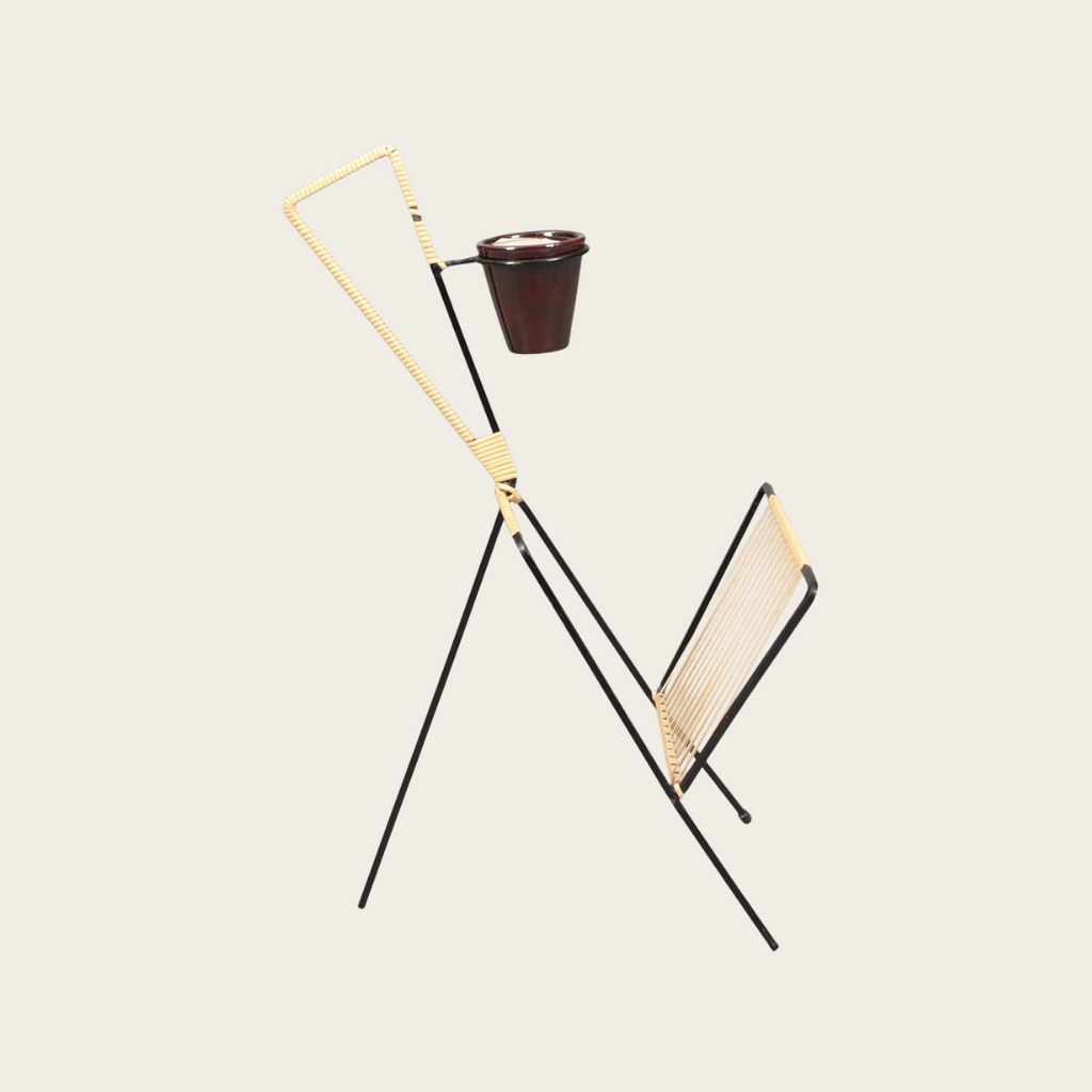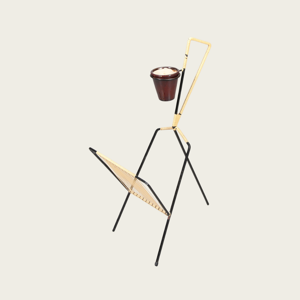 1950s, Sweden. Magazine rack featuring a sturdy wrought iron construction with elegant rattan wrapping throughout for a timeless vintage look. It includes an integrated ceramic ashtray, combining storage and functionality in one stylish piece.