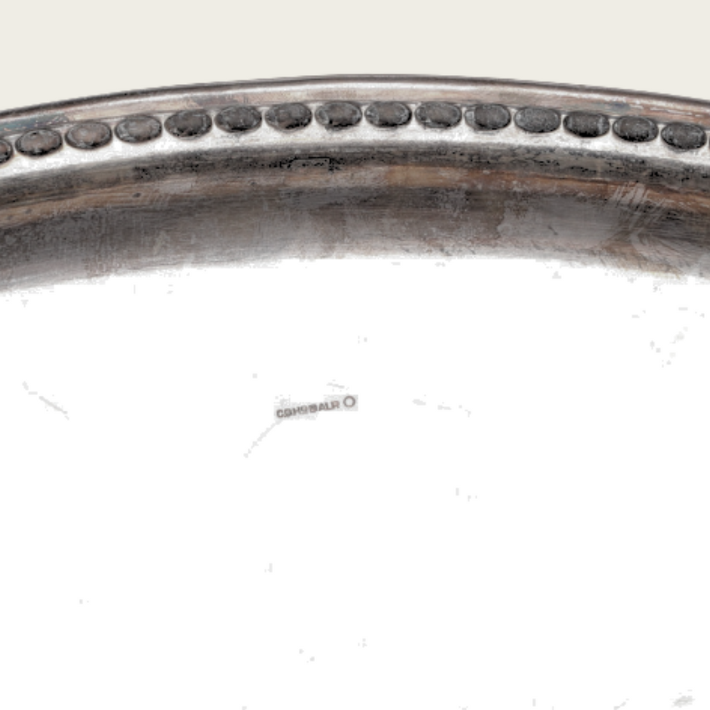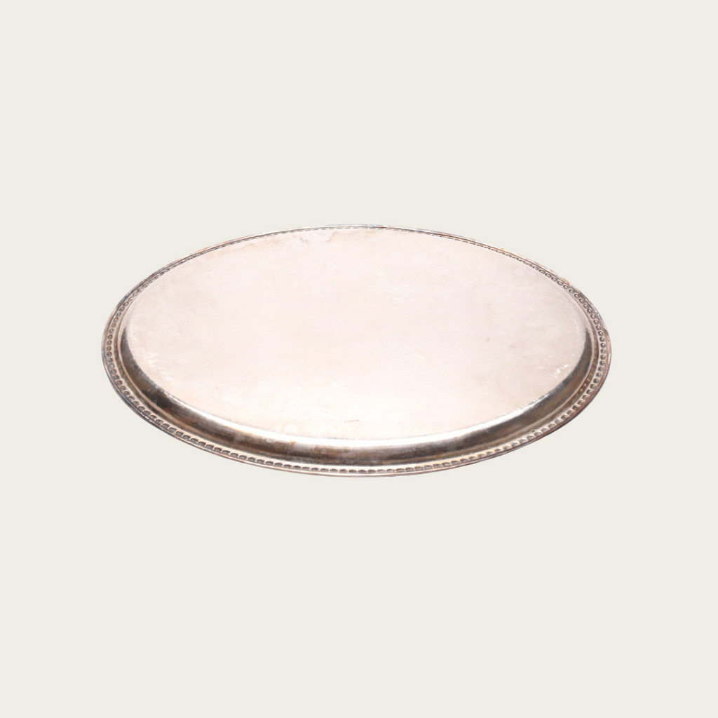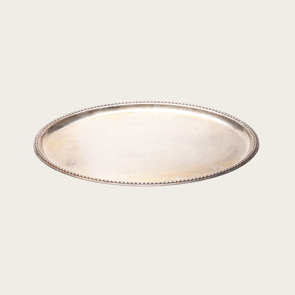 This 1960s hammered silver tray by C.G. Hallberg features a raised string of pearl-shaped border detail and is stamped with the designer’s mark on the underside.