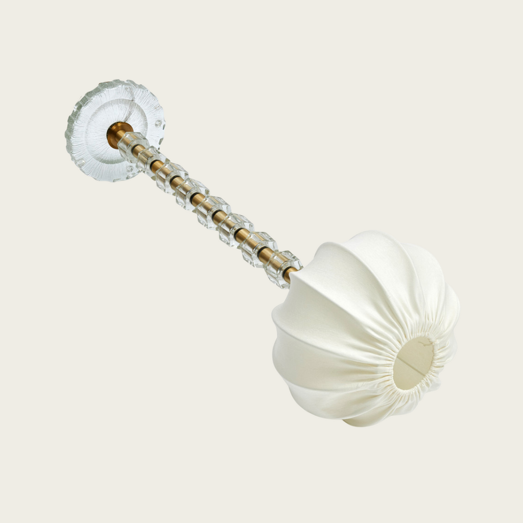 1960s, Sweden. Model RD-1990. Designed by Carl Fagerlund for Orrefors, this rare piece features a cast glass body paired with a matte brass frame and a globular fabric shade. The lamp is in excellent vintage condition.
