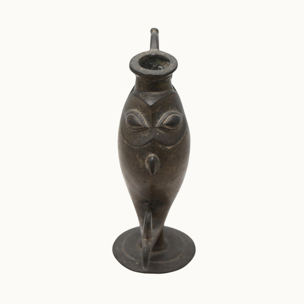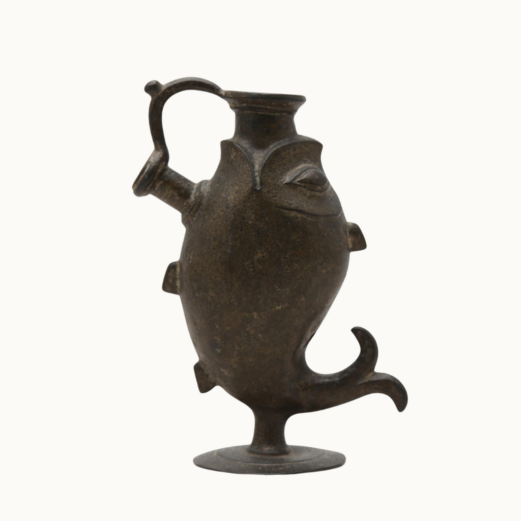 1930’s Sweden. Sculptural archaic bronze fish vessel with handle and beautiful patina. Can be used as a bud vase or as a candleholder.