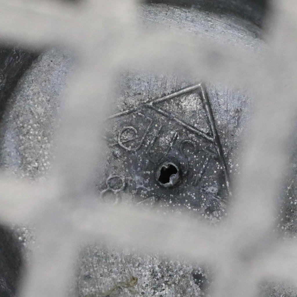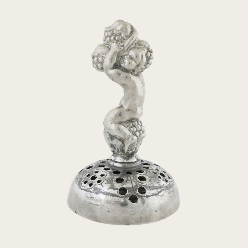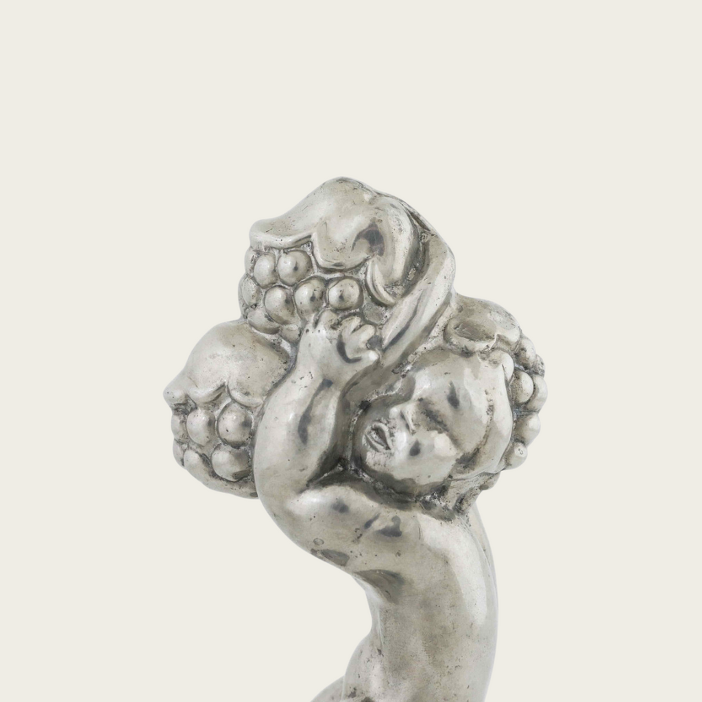 1930s, Denmark. This Art Deco pewter piece, model 841, features a detailed cherub holding blackberries. Designed and stamped by Just Andersen, it carries the maker’s mark on the underside. The piece combines decorative sculpture with practical function as a flower frog.