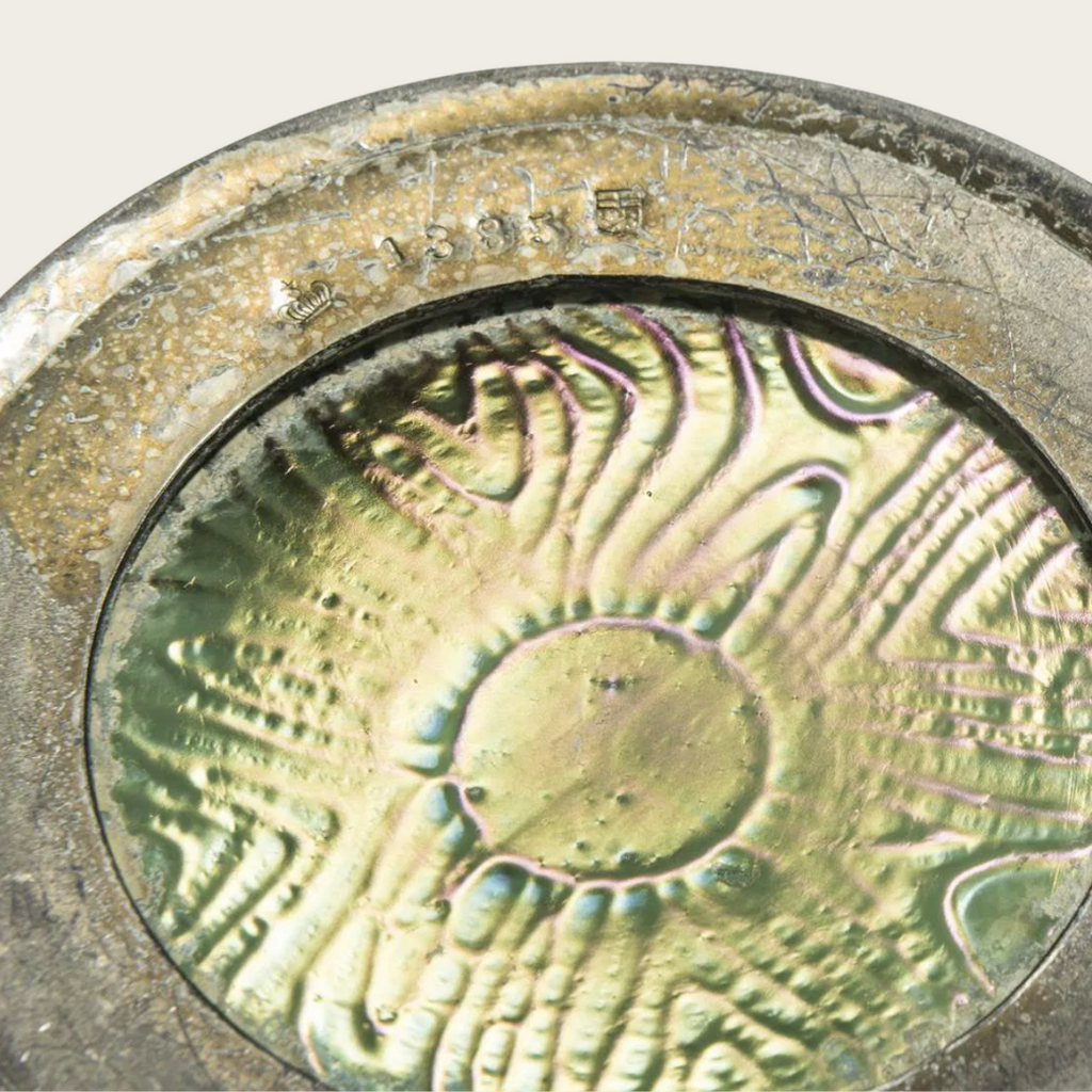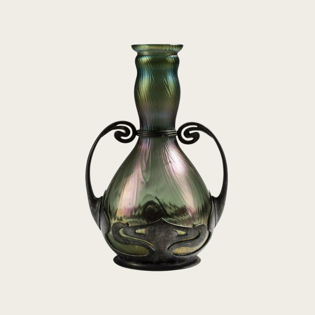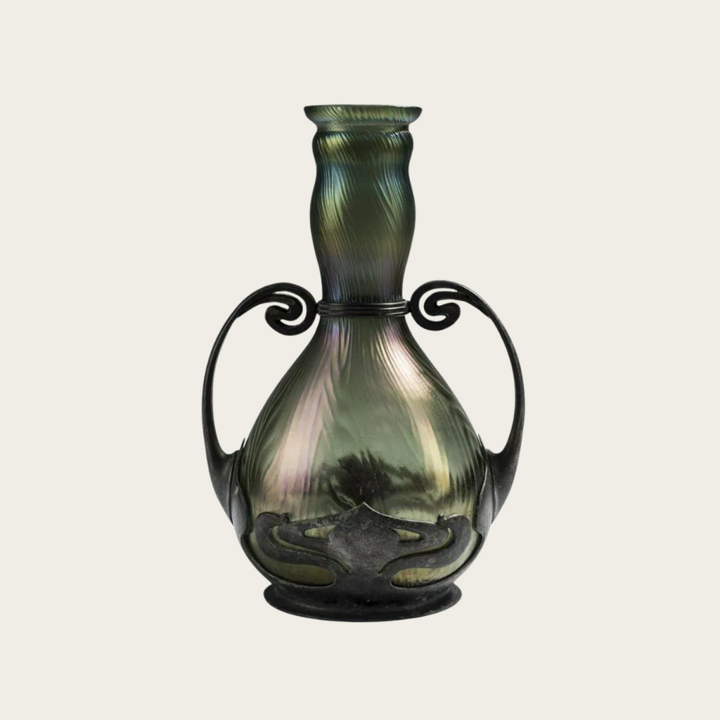 Austria 1920’s. Art Nouveau green pearlescent glass vase attributed to Loetz by F. Van Hauten with sculptural pewter handles.