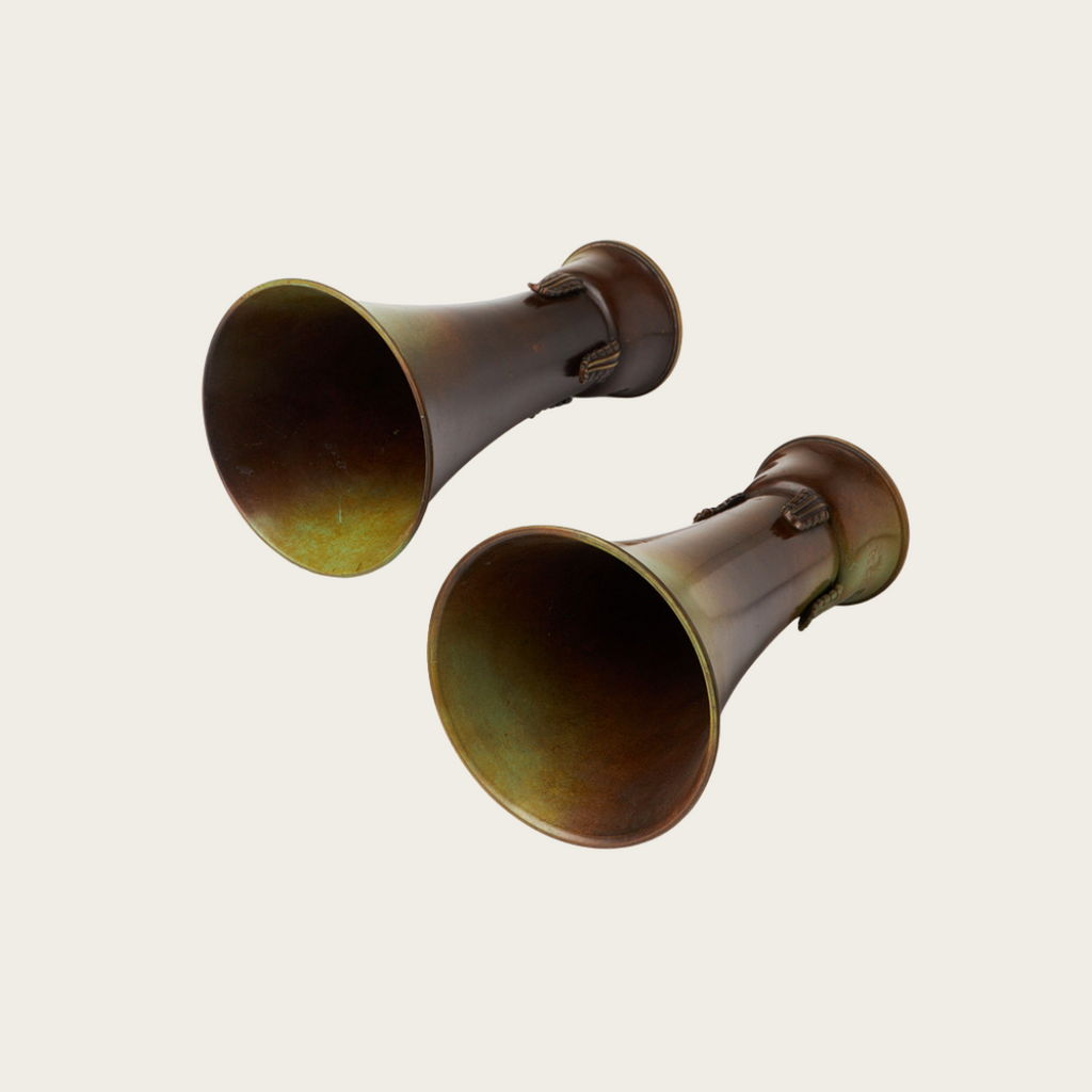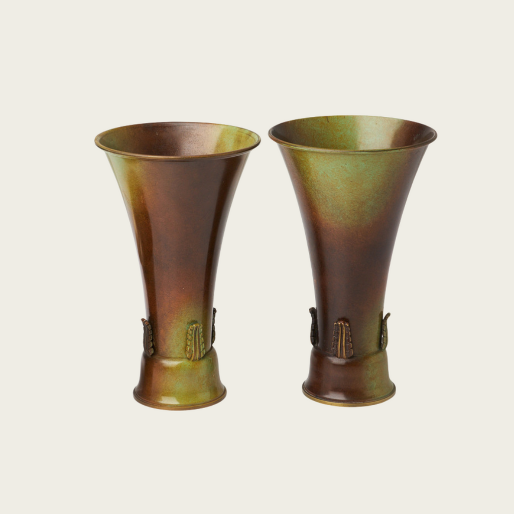 1930s, Sweden. Bronze "Kunga Vasen" vases by Ystad Metall featuring a tapered shape with Swedish Grace style leaves decorating the base. The item, Kunga Vasen, was named after King Gustav V, who bought one for himself. Each vase is stamped by the maker on the underside.