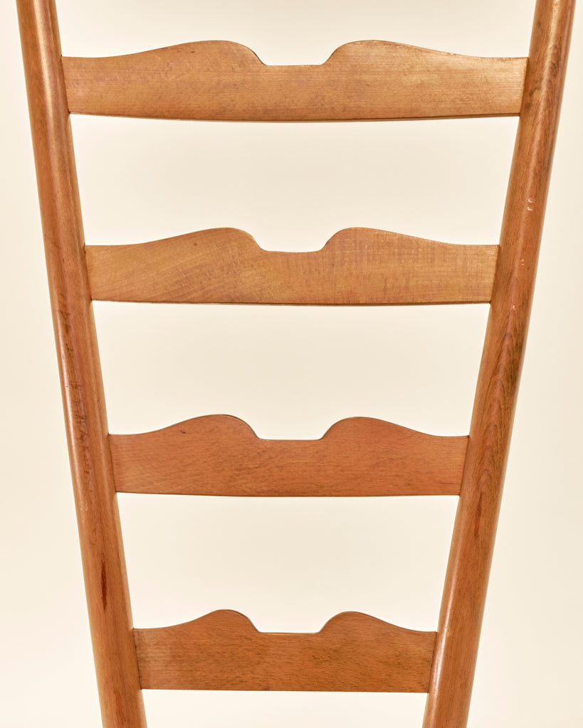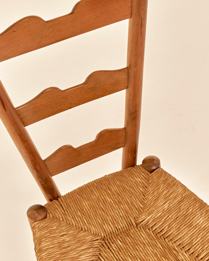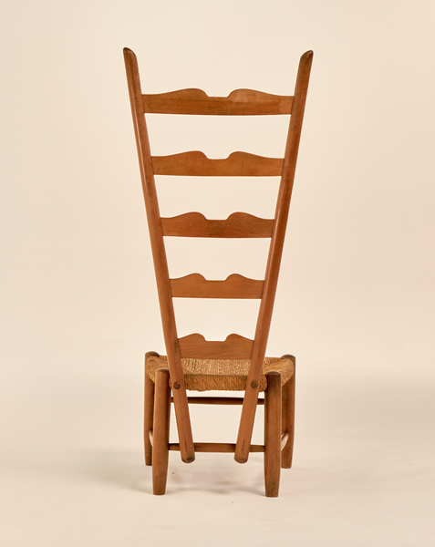1939, Italy. Fireside Chair by Gio Ponti for Casa e Giardino. With a solid walnut ladder back frame featuring sculptural carved details typical in Gio Ponti's work. The natural woven rush seat is tightly woven and the frame is in great vintage condition.