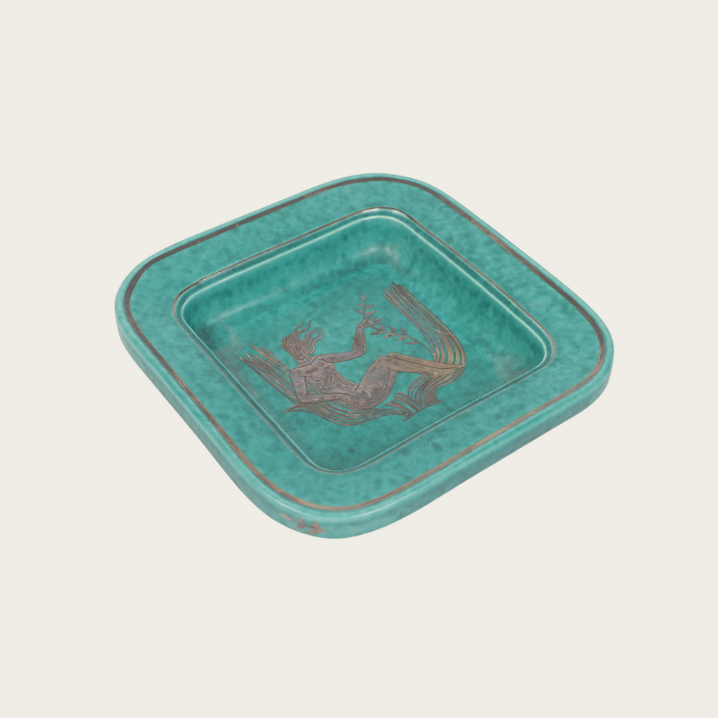 1972, Sweden. This footed dish is a striking example of Wilhelm Kåge’s Argenta collection for Gustavsberg Factory. Crafted in stoneware, it features a speckled turquoise glaze and silver leaf detailing that highlights an Art Deco mermaid at its center. The dish bears the maker’s mark on the underside.