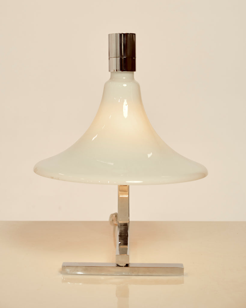 1969, Italy. This table lamp, created by designers Franco Albini and Franca Helg and produced by Sirrah, is part of the AM/AS series—a versatile modular lighting system with interchangeable bases and shades. It is in excellent original condition with no glass damage.