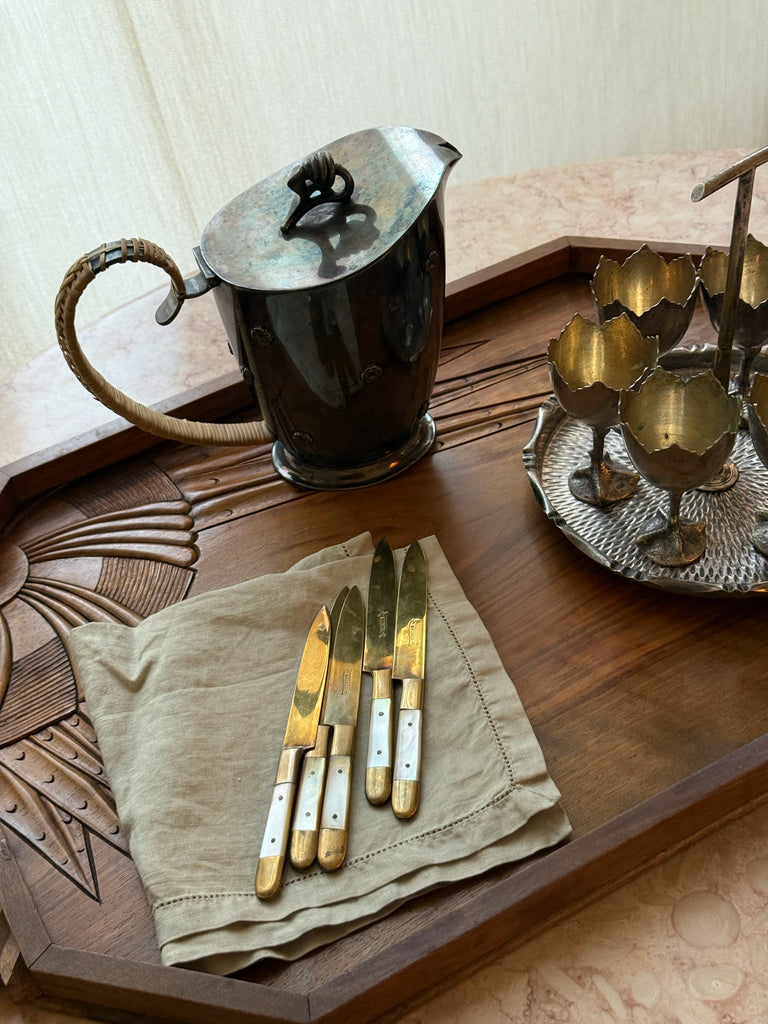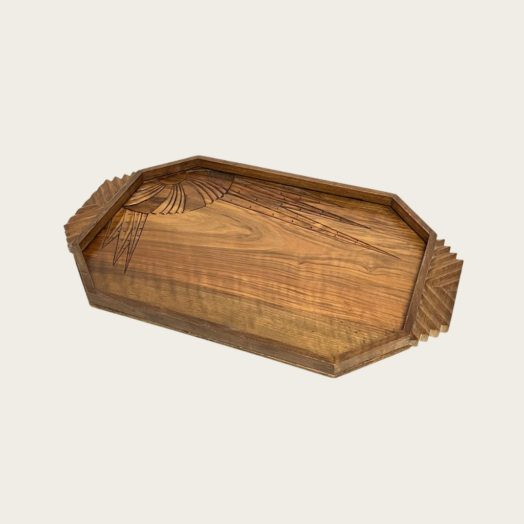 1960s, France. With carved wood details and gallon handles. Designer stamp on underside.