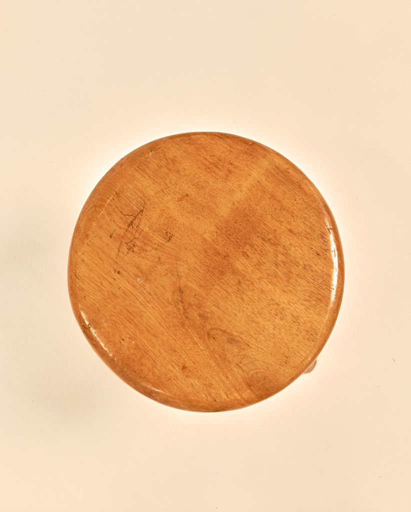 1930's French modernist solid walnut milking stool with tapered legs and a shiny wax finish. In overall good condition with few light surface level scratches to stool seat.