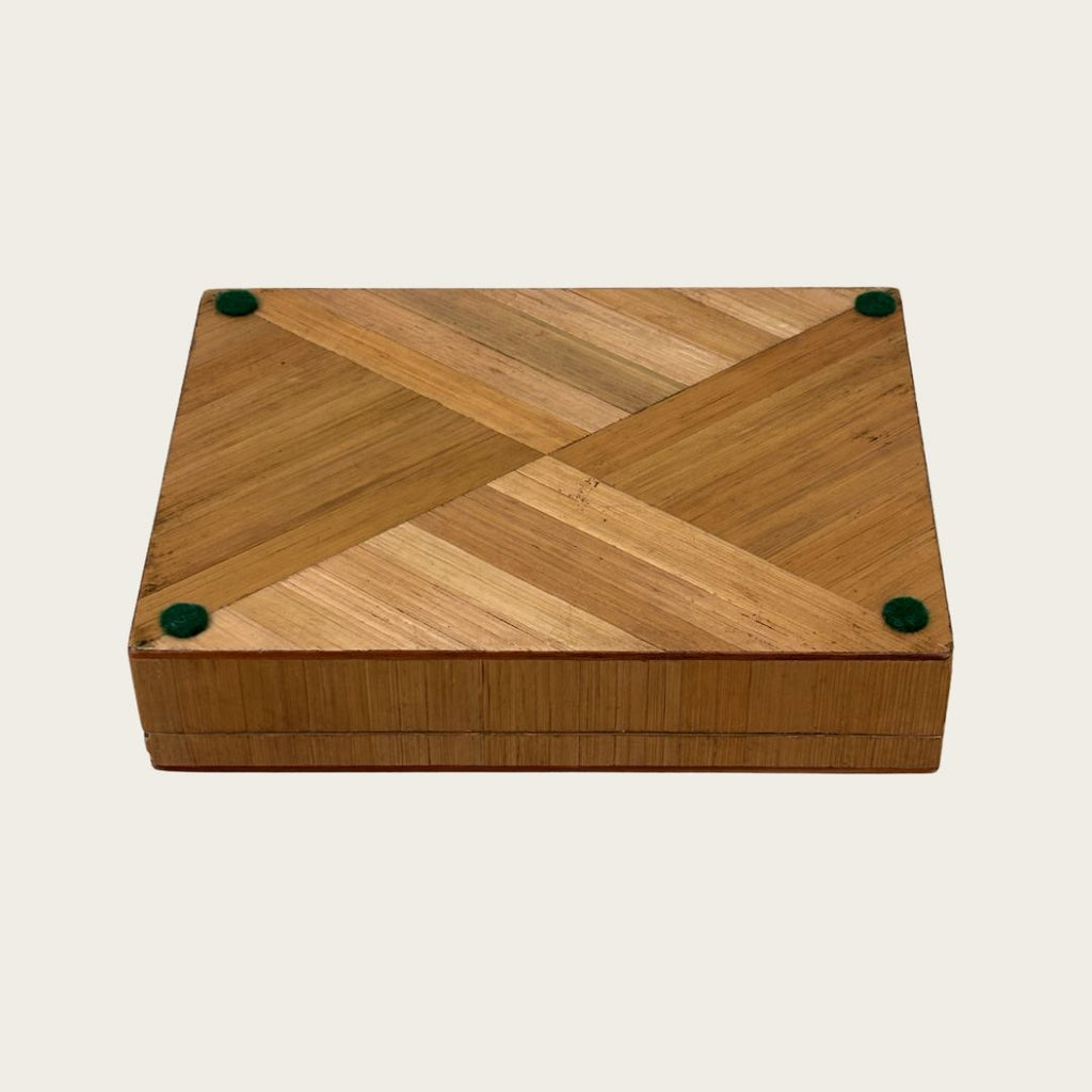 Inspired by Jean Michel Frank's refined aesthetic, this French straw marquetry box features an oak veneer interior and practical partition divider.