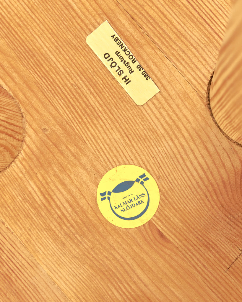 1970's Swedish solid pine 3-legged stool, designed by distinguished Swedish Designer, Ingvar Hildingsson. With designer signature "IH" featured on underside, and labels by manufacturer Kalmar Läns Slöjdare IH Slöjd Rugstorp still intact. In excellent condition.
