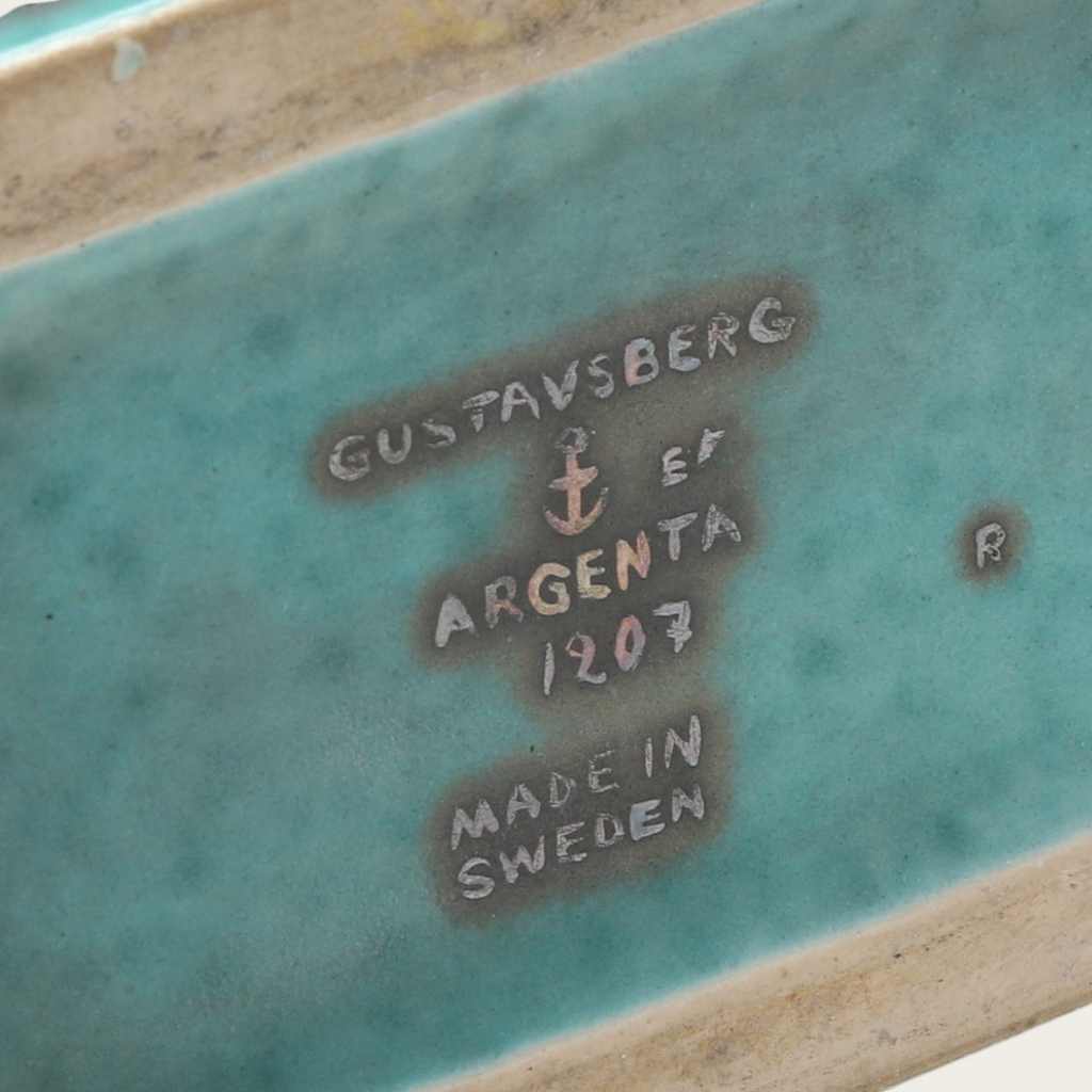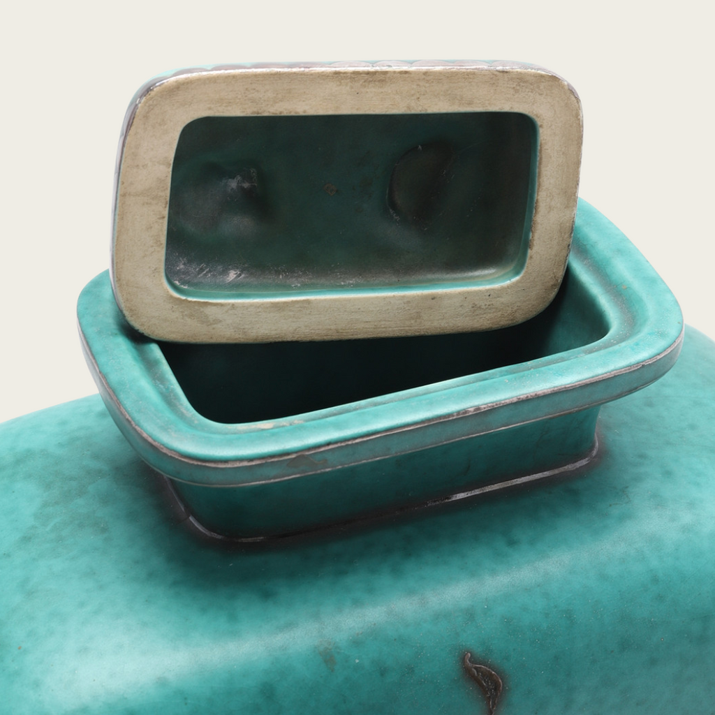 1934, Sweden. This glazed stoneware lidded urn, model 1207, part of Wilhelm Kåge’s Argenta stoneware collection made for the Gustavsberg Factory. It features silver leaf decorations depicting a bird with a snake on one side and flowers on the other. The piece is marked and numbered on the underside.