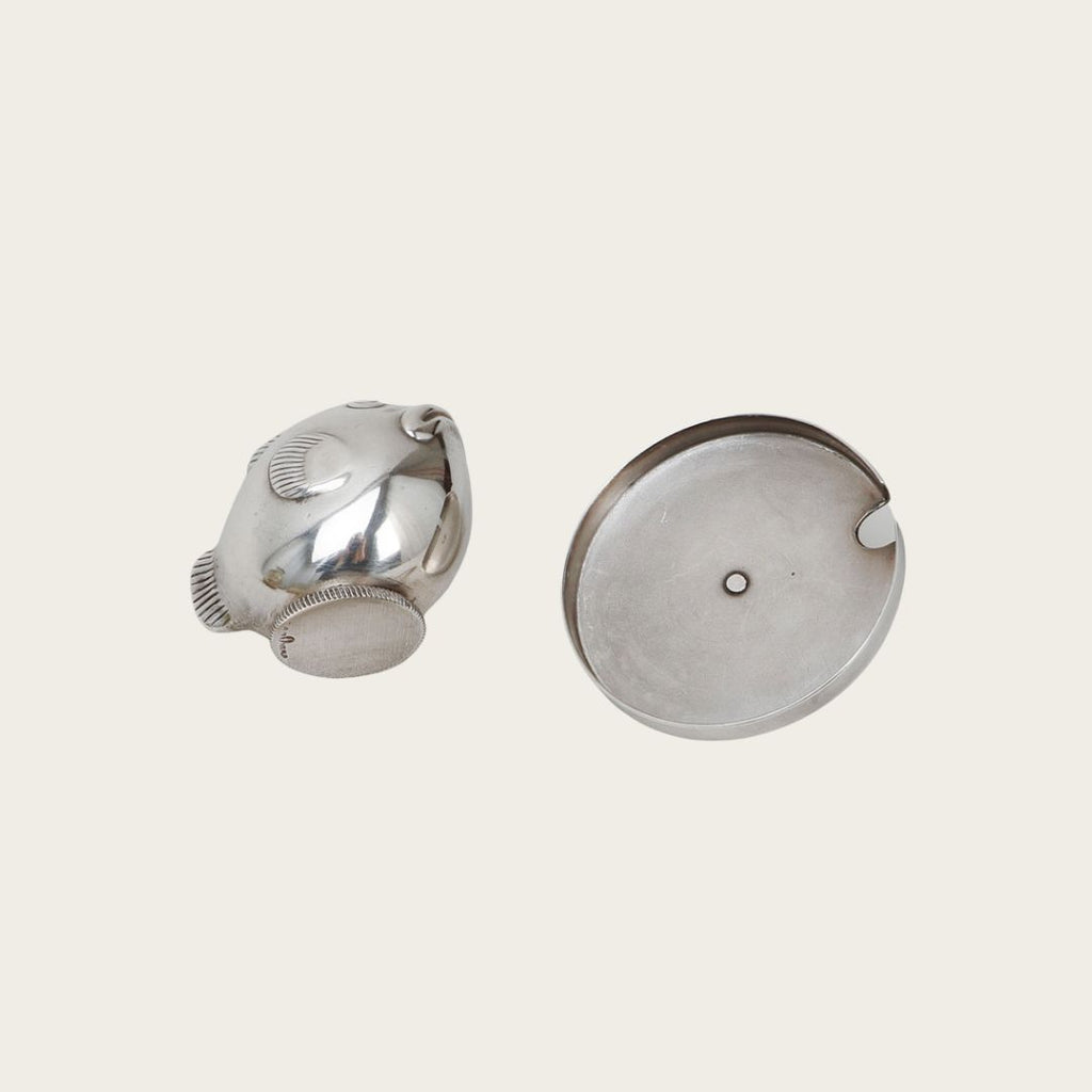 This 1930s Swedish set features five nickel silver pieces, including a teak tray with curved decorative handles, salt and pepper shakers shaped like fish, a mustard jar with lid, and a vinegar decanter. Each piece is stamped by GAB on the underside and is in great condition.