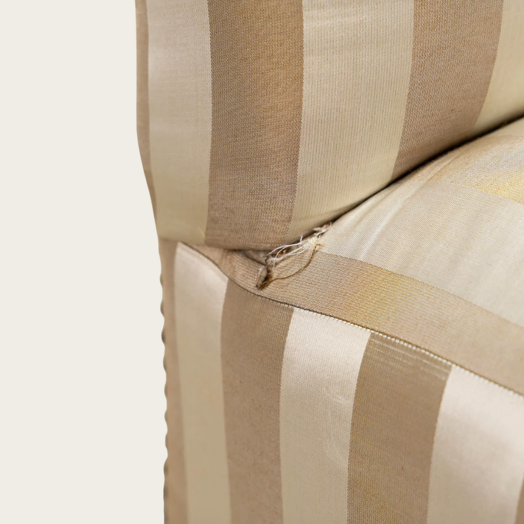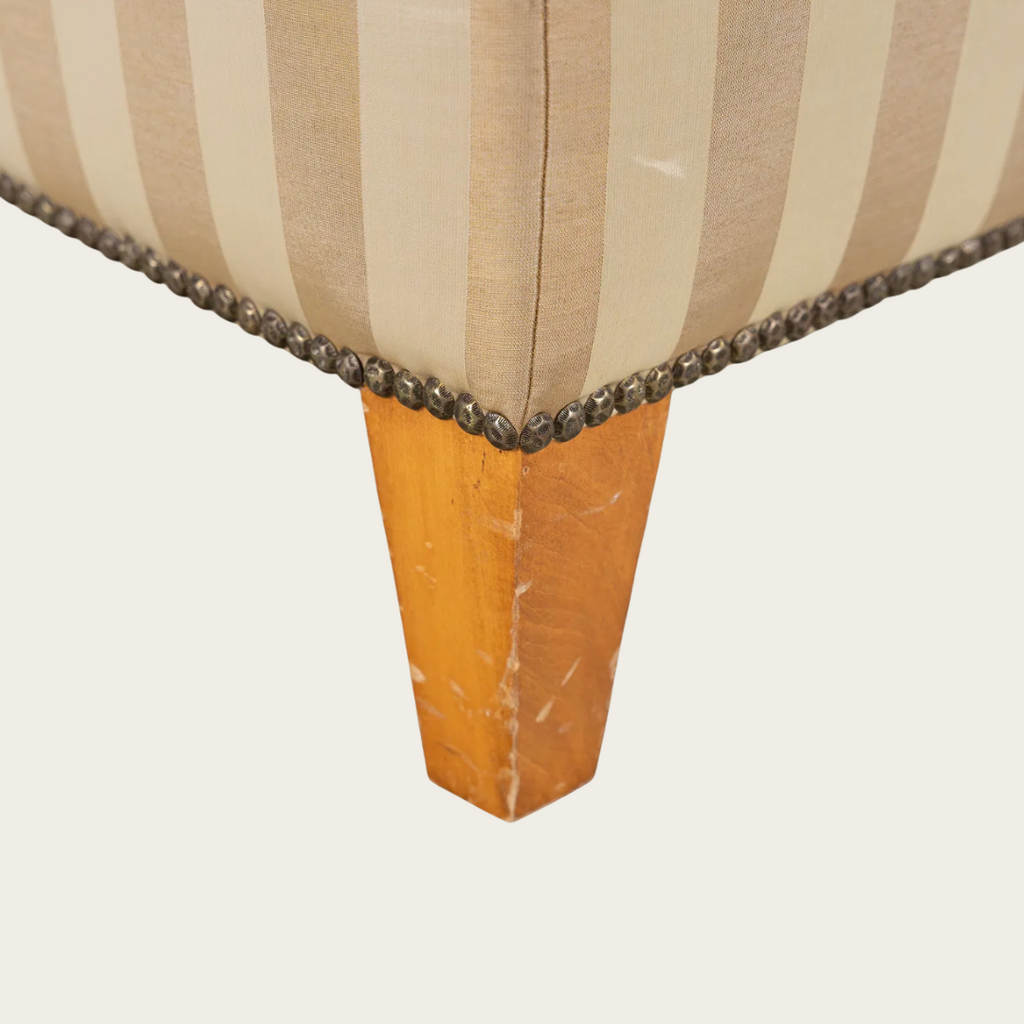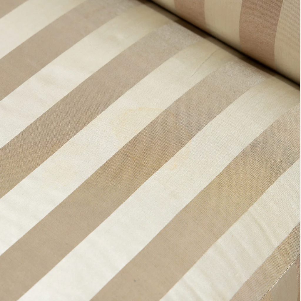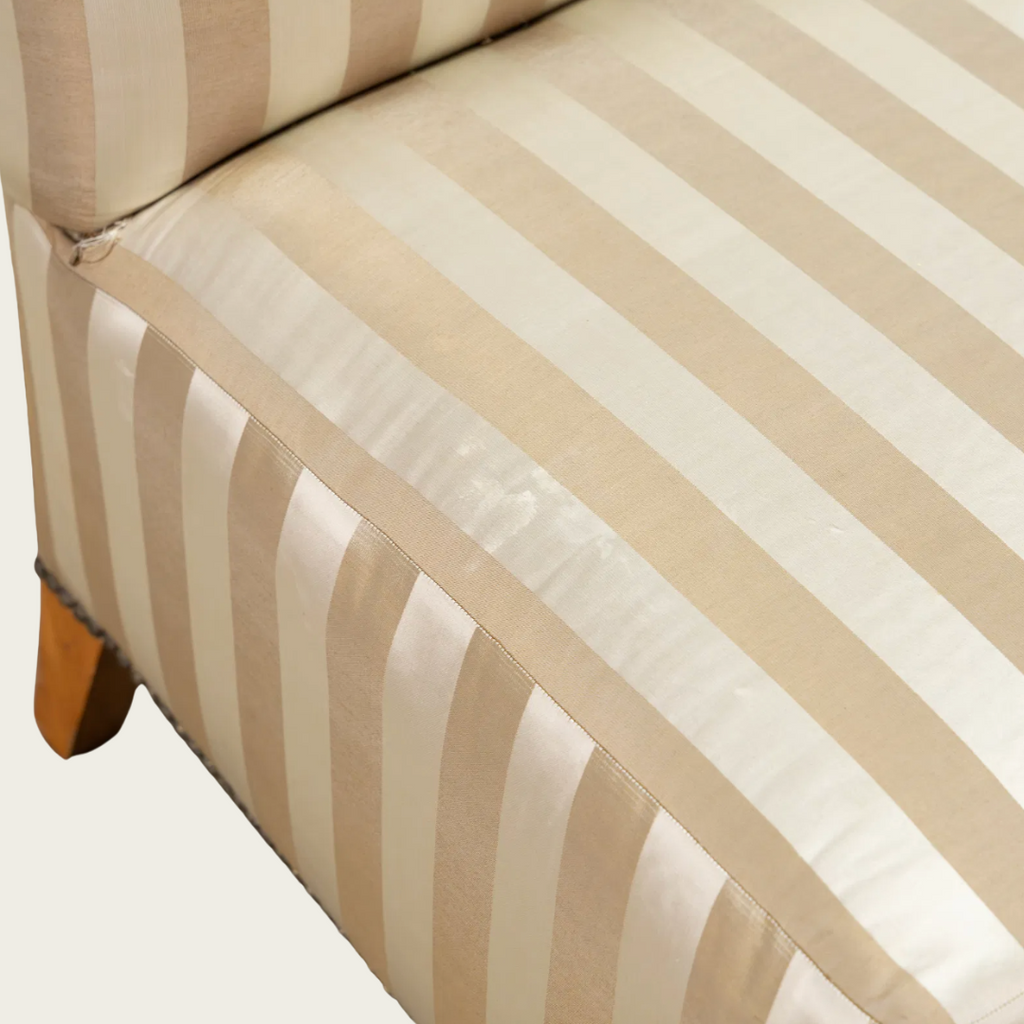 1940s, France. Featuring tapered birch legs and a gently scalloped backrest edge. Upholstered in the original satin striped fabric with some wear and tear.
