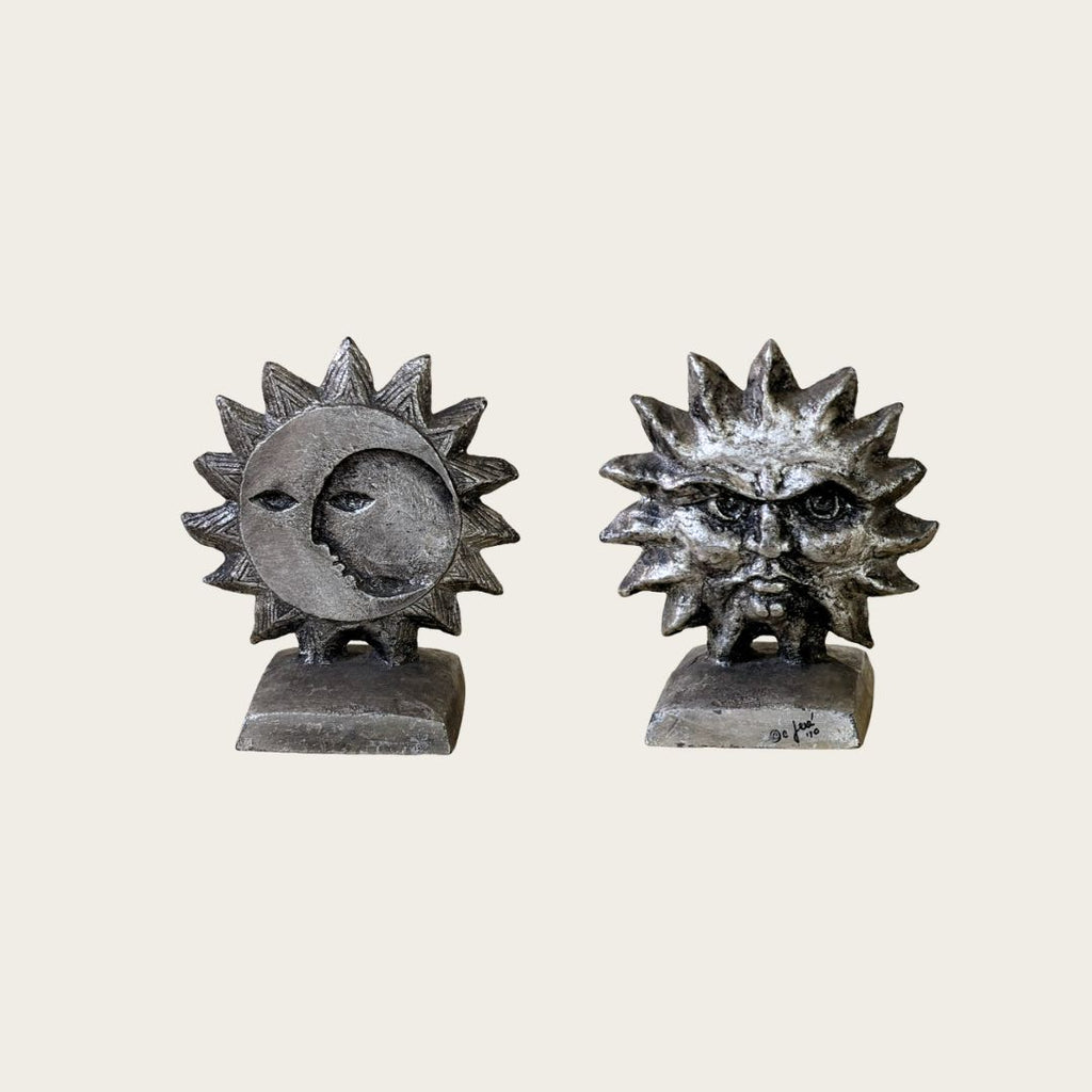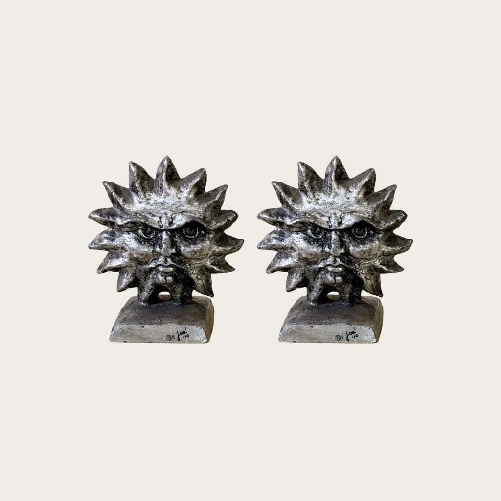 Sculptural bookends with sun and moon on opposite sides. Silvered wrought iron. Signed and dated by artist. Price is for the pair.