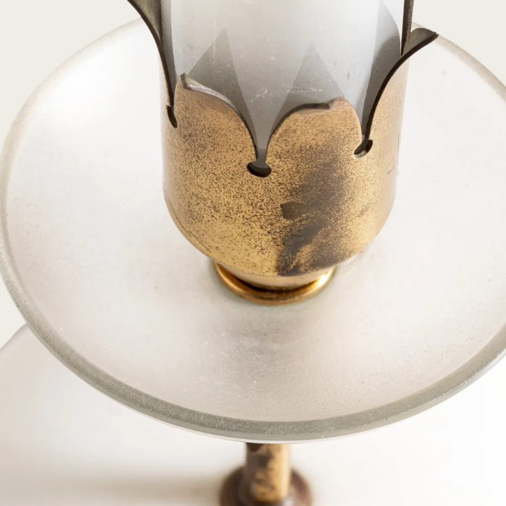 1950s, Italy. This pair of Art Deco table lamps by Angelo Lelii, produced by Arredoluce in Monza, Italy, features marble and brass construction with curved, etched glass cone shades. The flared brass frames resemble flower petals, combining elegance and unique design. Sold and priced as a pair.