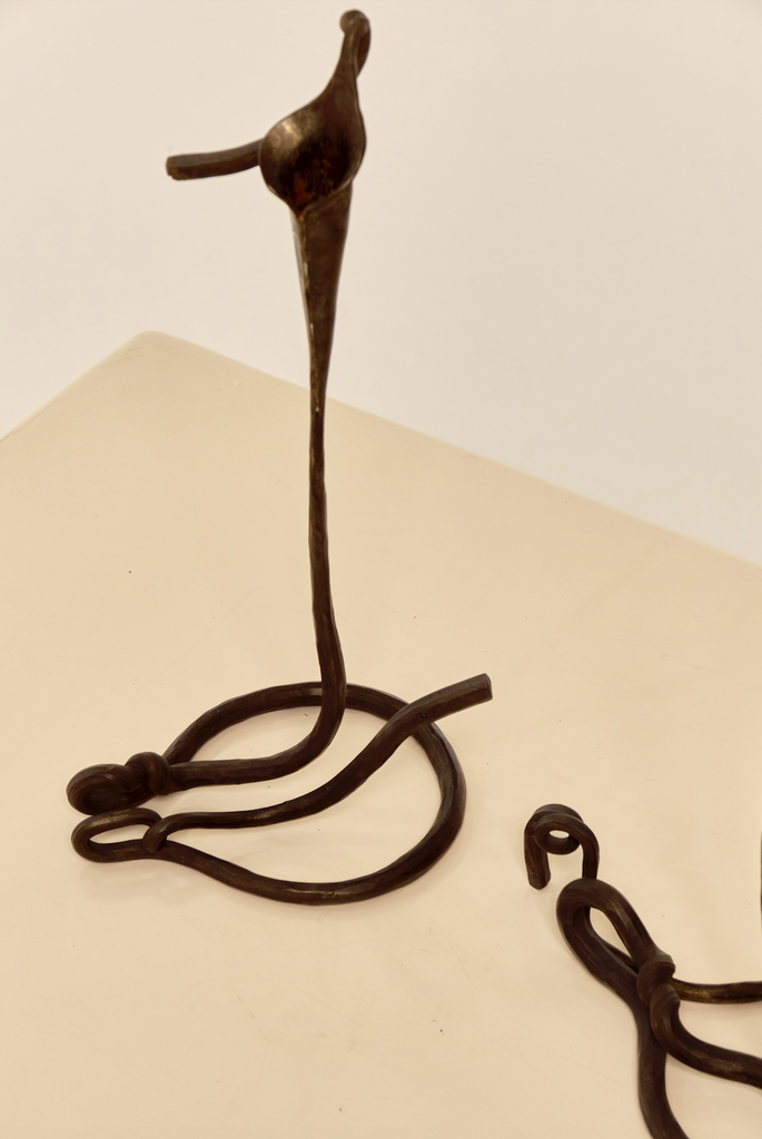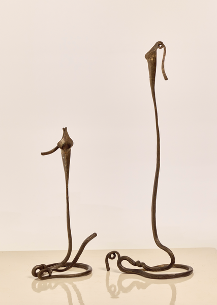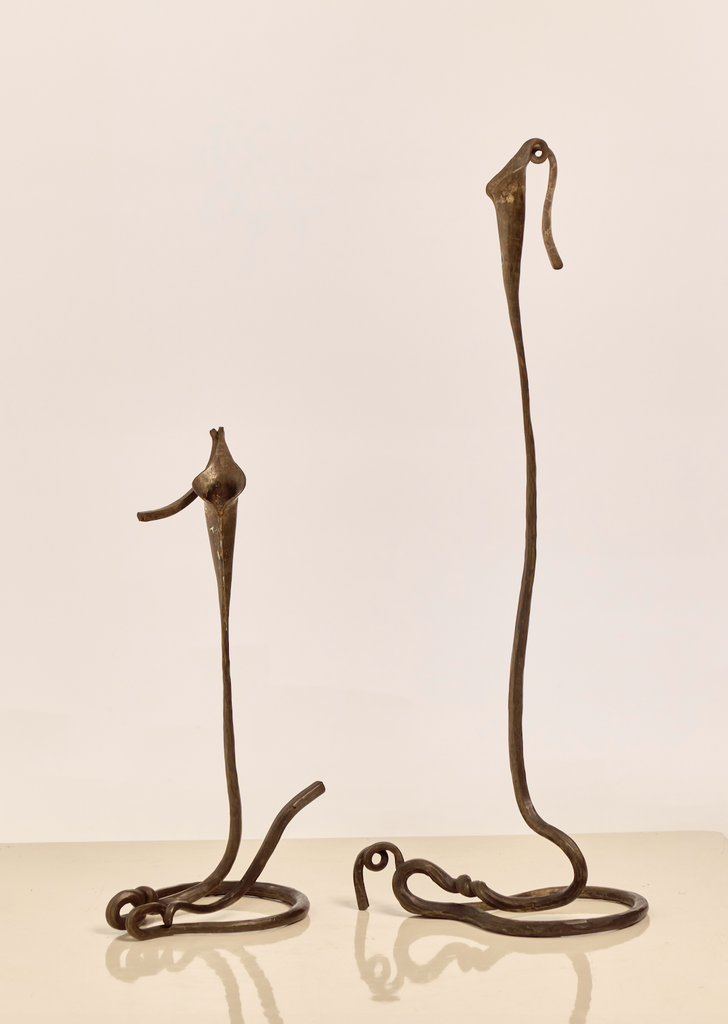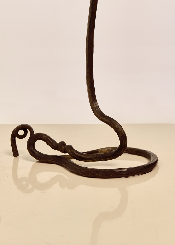 1980s. A large pair of sculptural art nouveau style wrought iron calla lily candleholders by metal artist Jack Brubaker. The iron has a sinuous windy form and a beautiful patina. Marked by designer on underside.