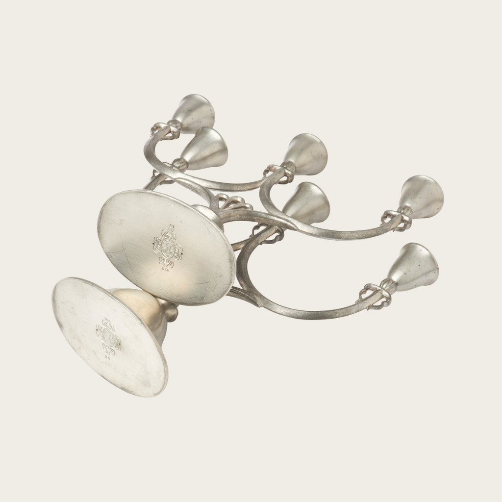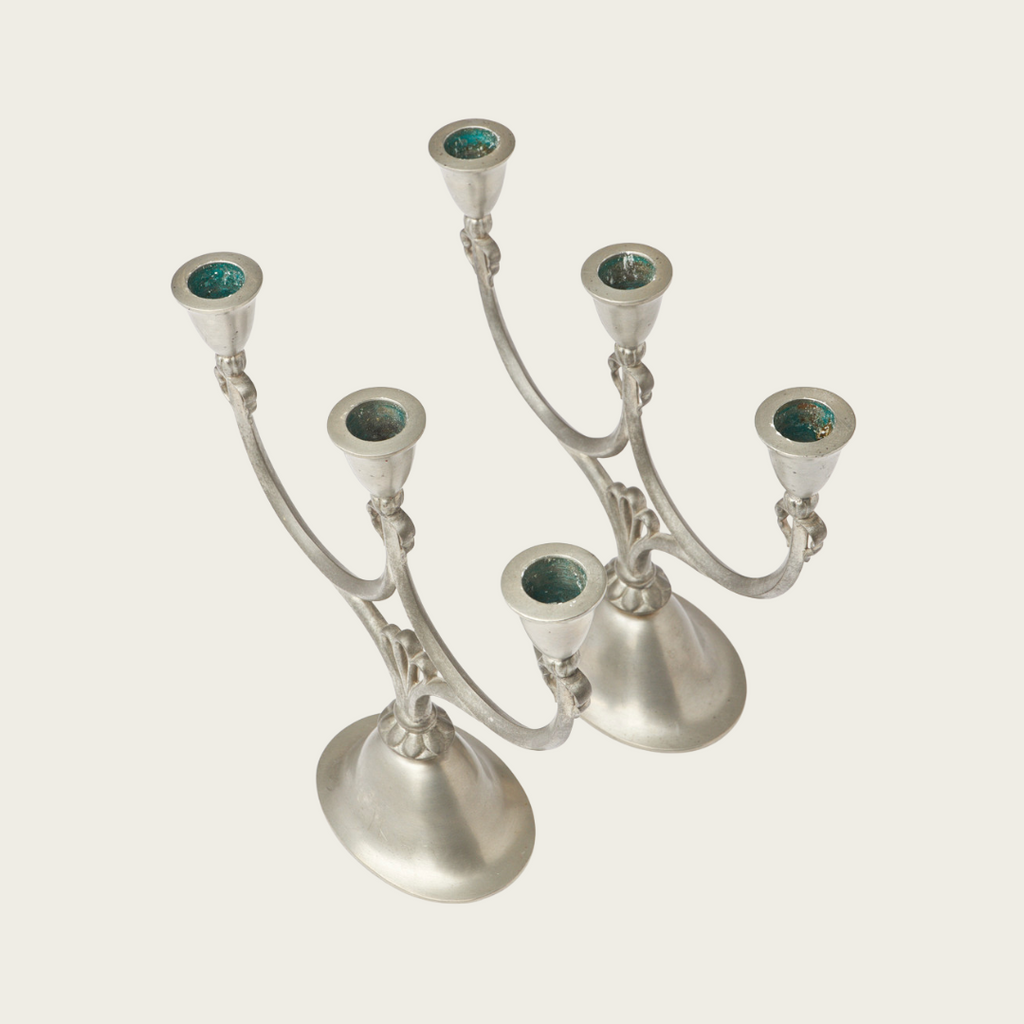 1931, Denmark. Just Andersen maker's mark on the underside. Each piece has a placement for three candles. Sold as a pair.