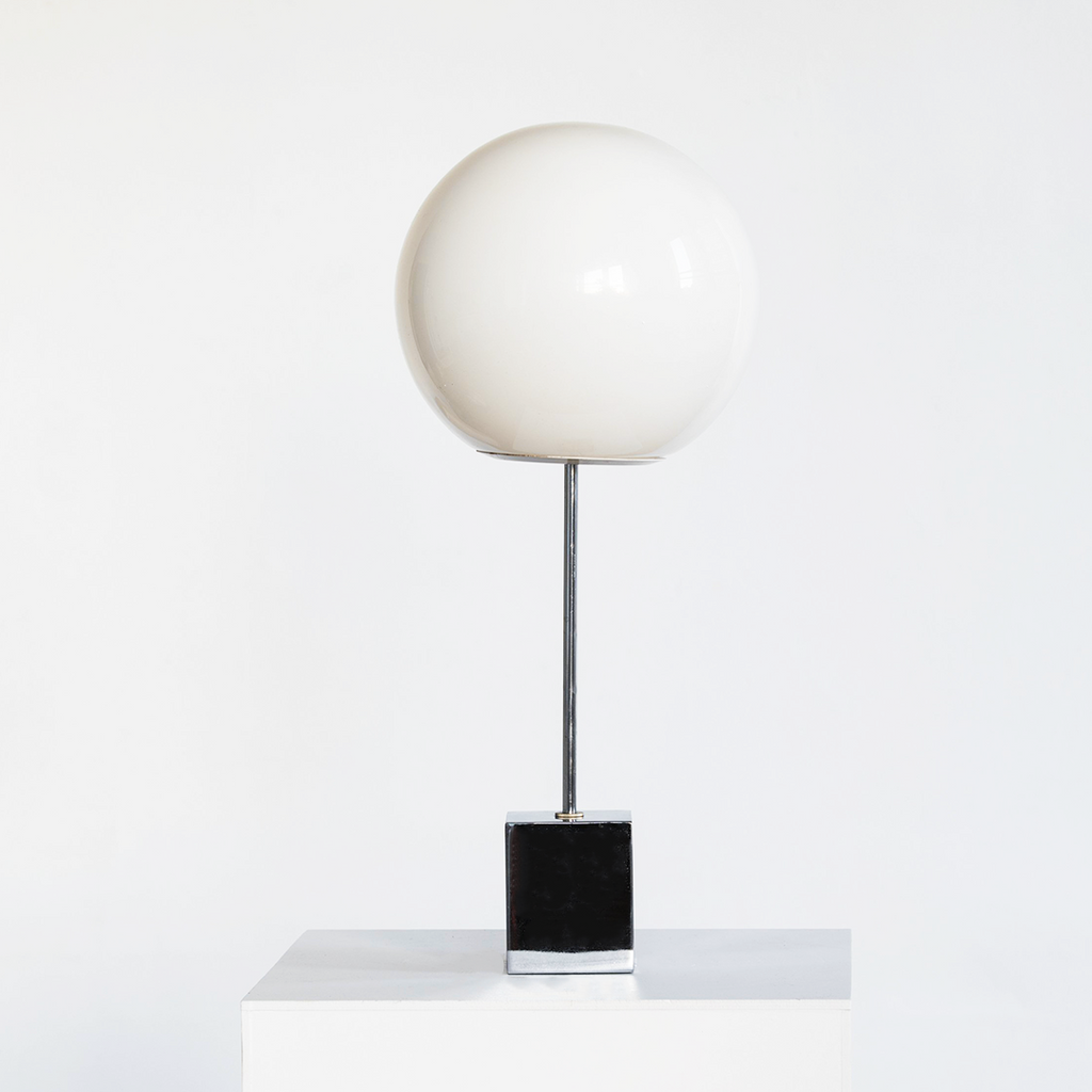 Robert Sonneman Lollipop table lamp with a weighted chrome cube shaped base, tubular stem and spherical glass globe designed and produced in the 1970’s. Designed in the years following the height of atomic age design, this lamp is an exploration of shape. This lamp is in great vintage condition and retains its Robert Sonneman sticker on the interior base. Recently rewired.
