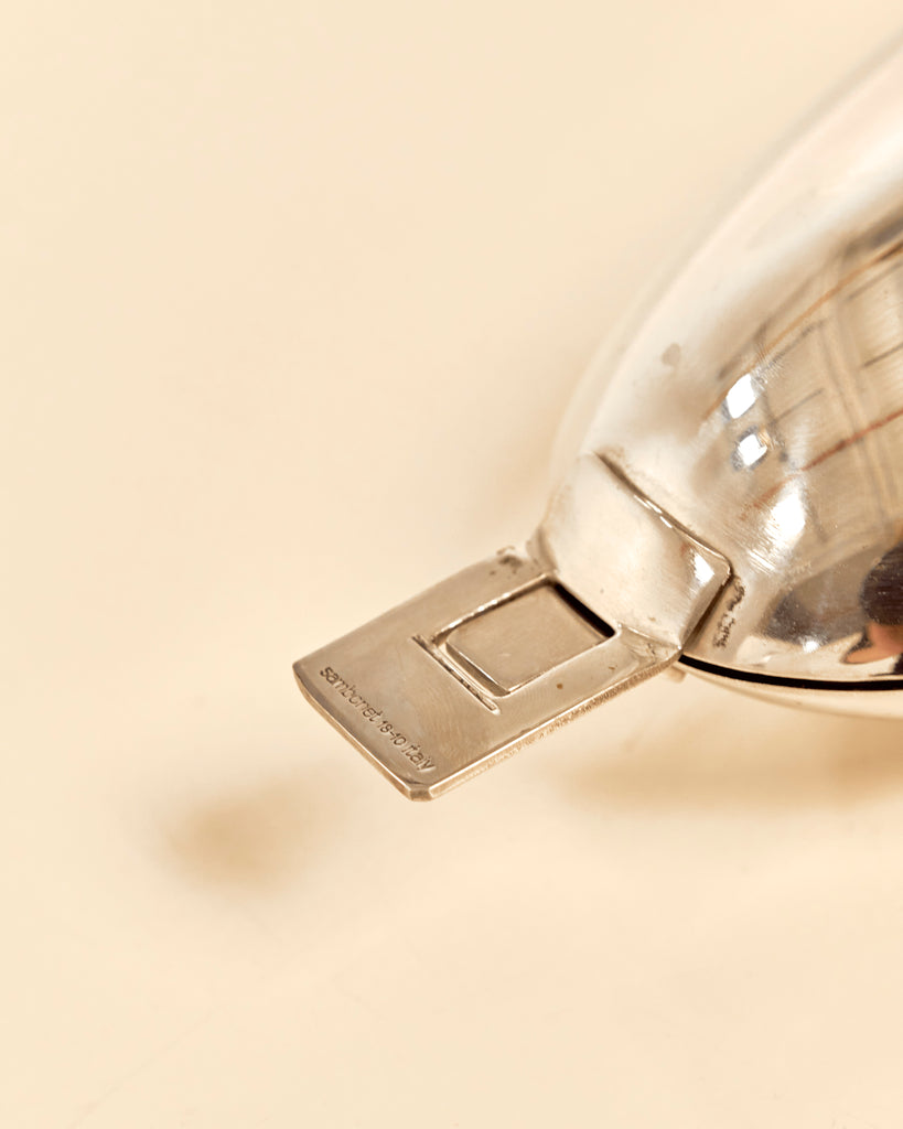 Designed in 1960s as a fish poacher by Italian designer Roberto Sambonet for Sambonet, this catchall bowl is great for storing lighters, matches and other loose table top items. It has a rounded shell shape and the two bowl halves are designed to provide three different opening options. The bowl was reissued with a slightly different design in the 1980's.