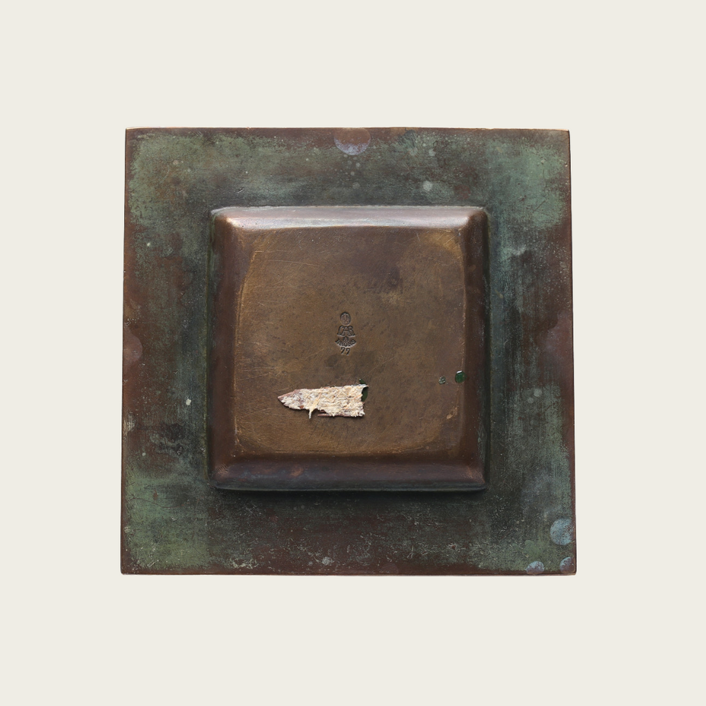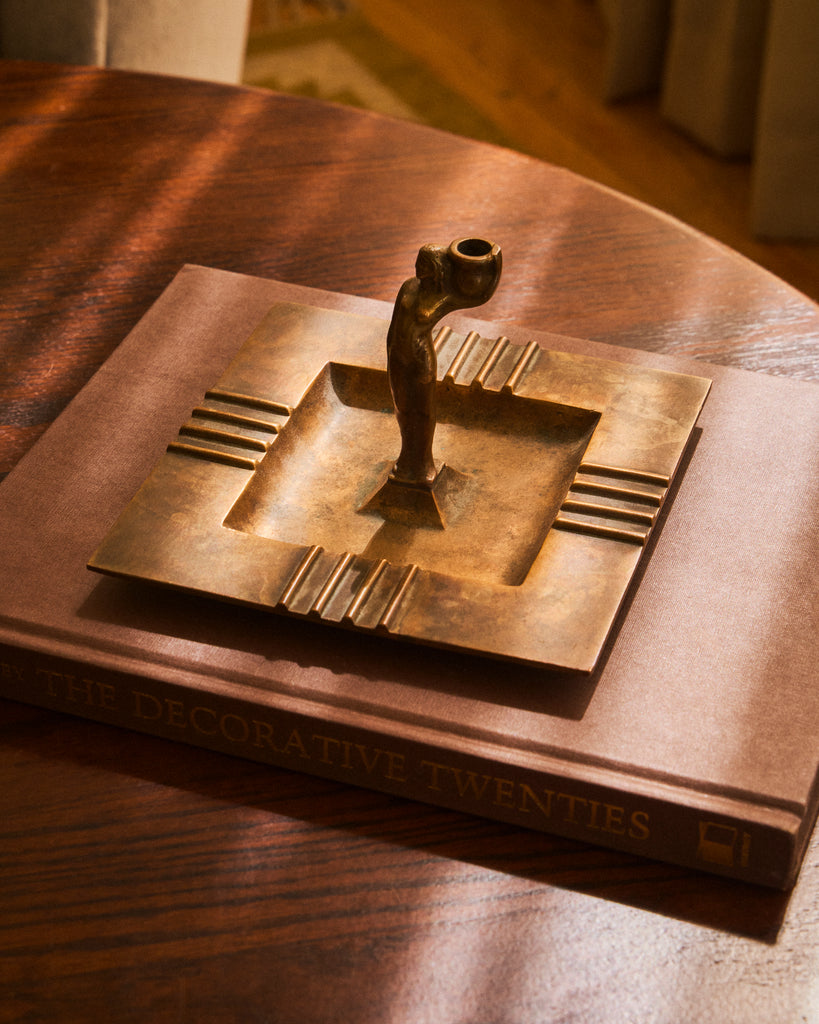 A sculptural bronze ashtray features a hand-forged design marked "No.77. GAB" on the underside. Its figurative woman motif adds artistic character, making it both a functional and decorative piece.