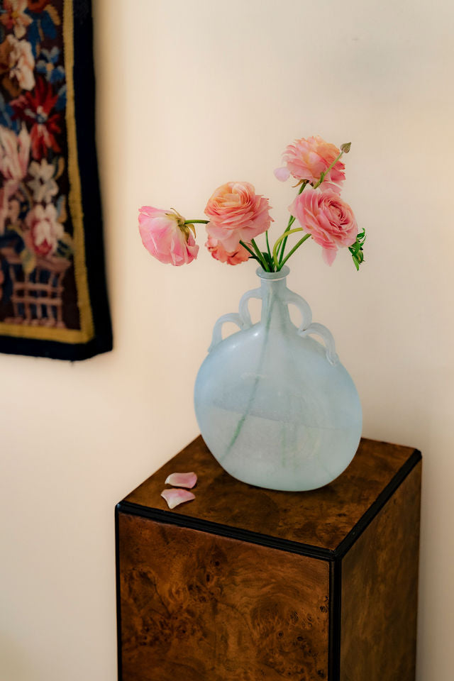 1950s, Italy. This Seguso Vetri d'Arte Scavo Murano glass vase features a narrow mouth and a delicate light blue color, reflecting classic 1950s Italian design. Crafted with expert Murano glassmaking techniques, it includes distinctive hanger details that add subtle elegance.